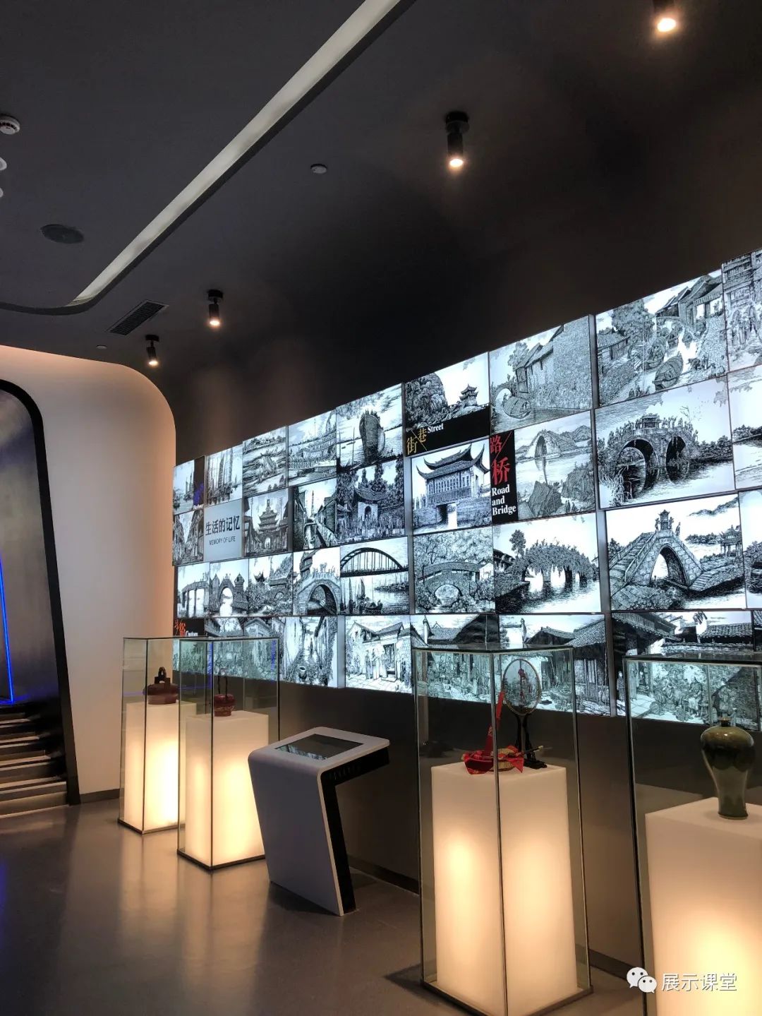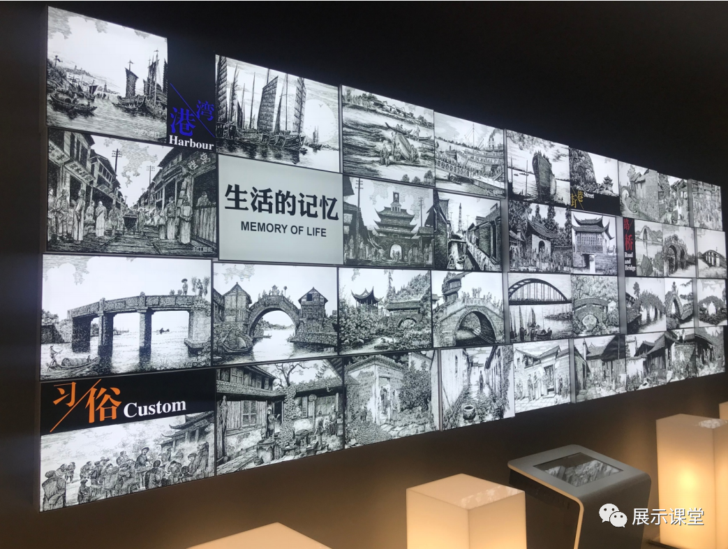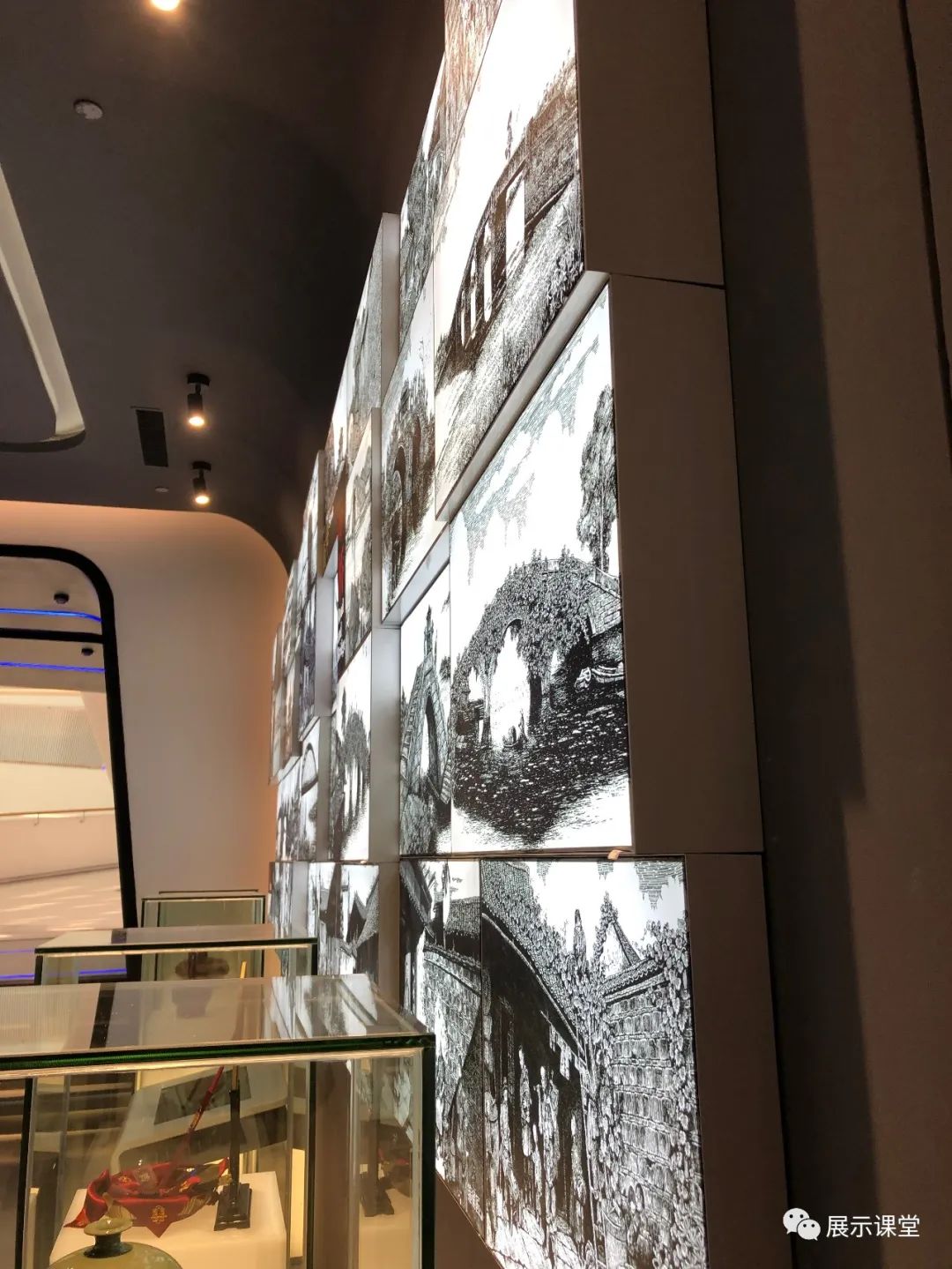 凸出的展板与内凹展板面相互错落,墙面层次比较丰富