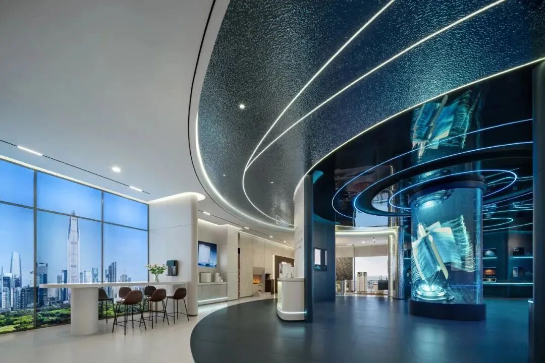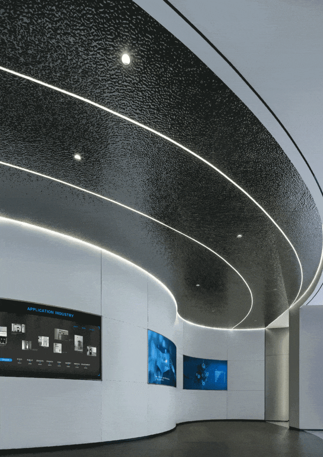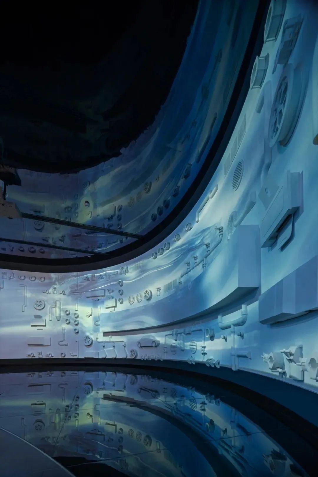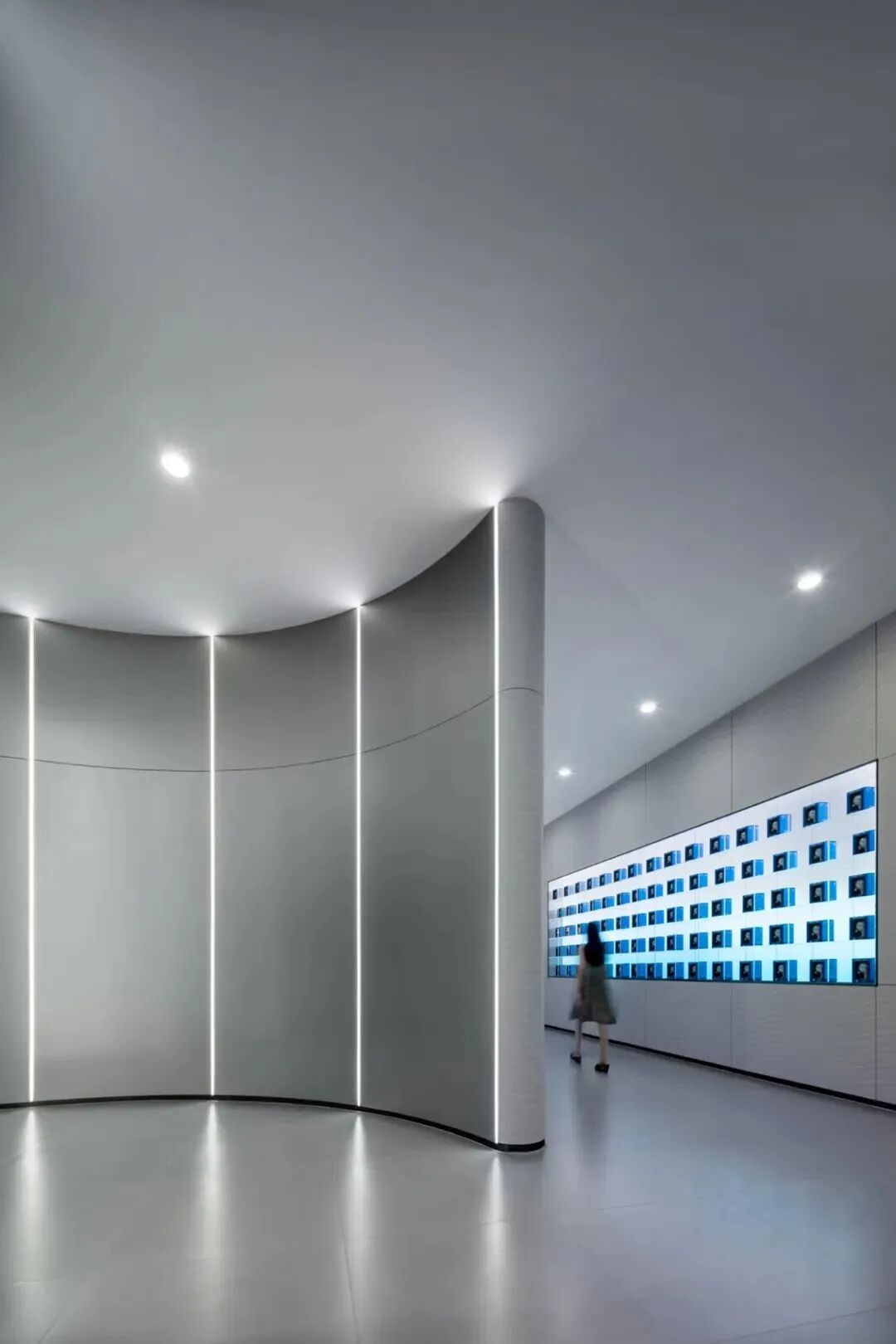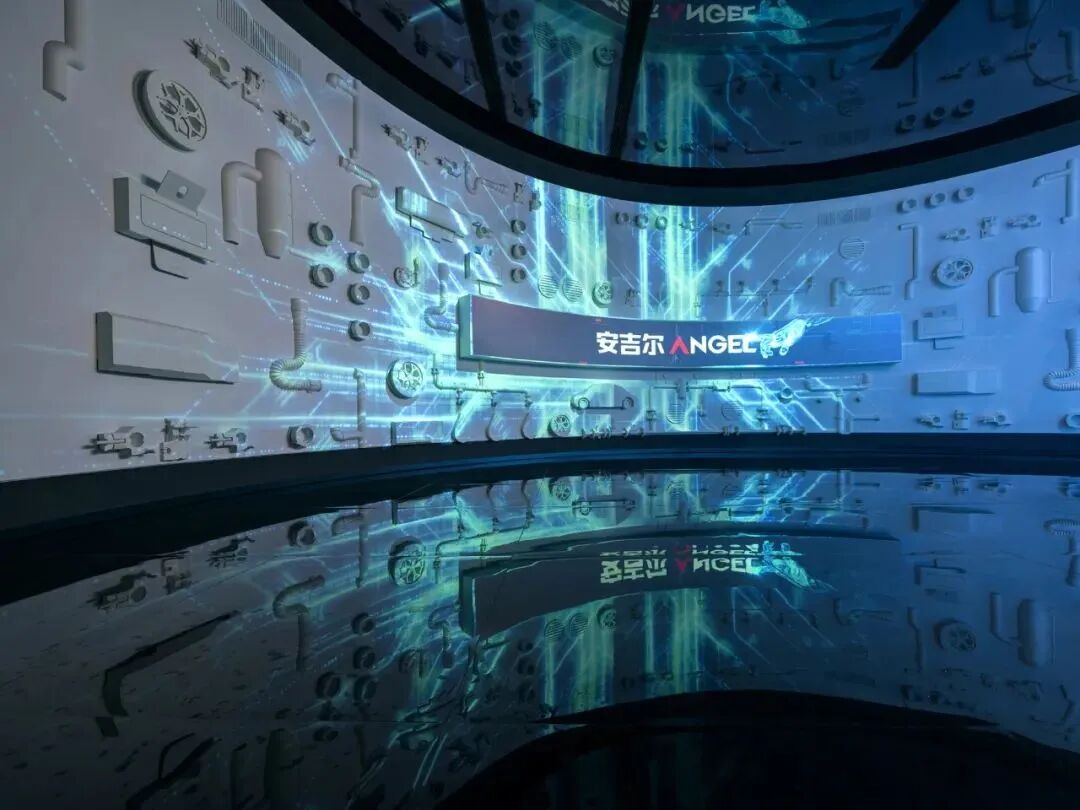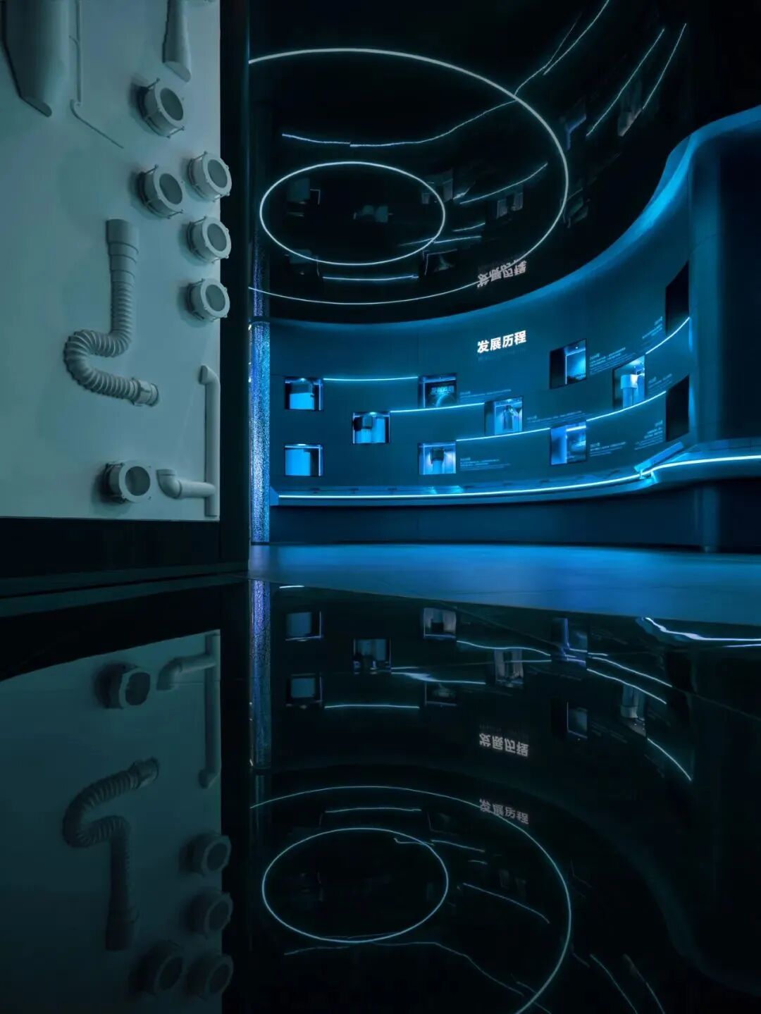 空间的弧形墙面与流畅的线条如同时光的涟漪、记忆的河床,沿着光的轨迹追溯着安吉尔37载的足迹,科技与时光相互折叠,每一个脚步都将触发水源与科技的长久对话。