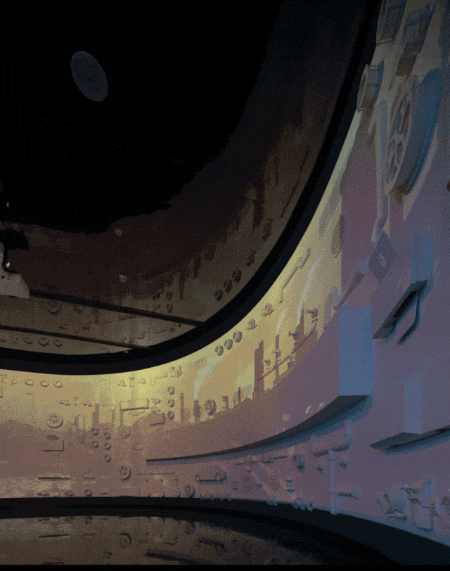 环绕弧形屏呈现水在污染破坏下逐渐失去纯净的过程,虚拟水体被工业废水、烟尘和人类活动的残迹侵蚀。