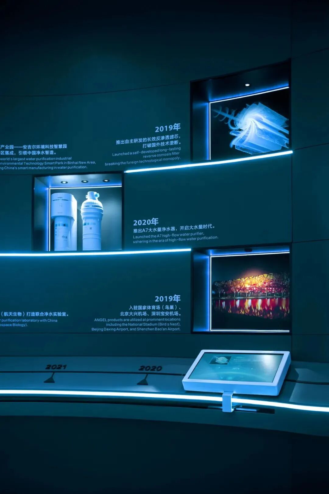 墙面以时间轴为核心设计,结合多媒体互动屏,参观者可通过触摸、滑动等方式与安吉尔的发展历程产生交互,了解在净水技术的突破与转折。