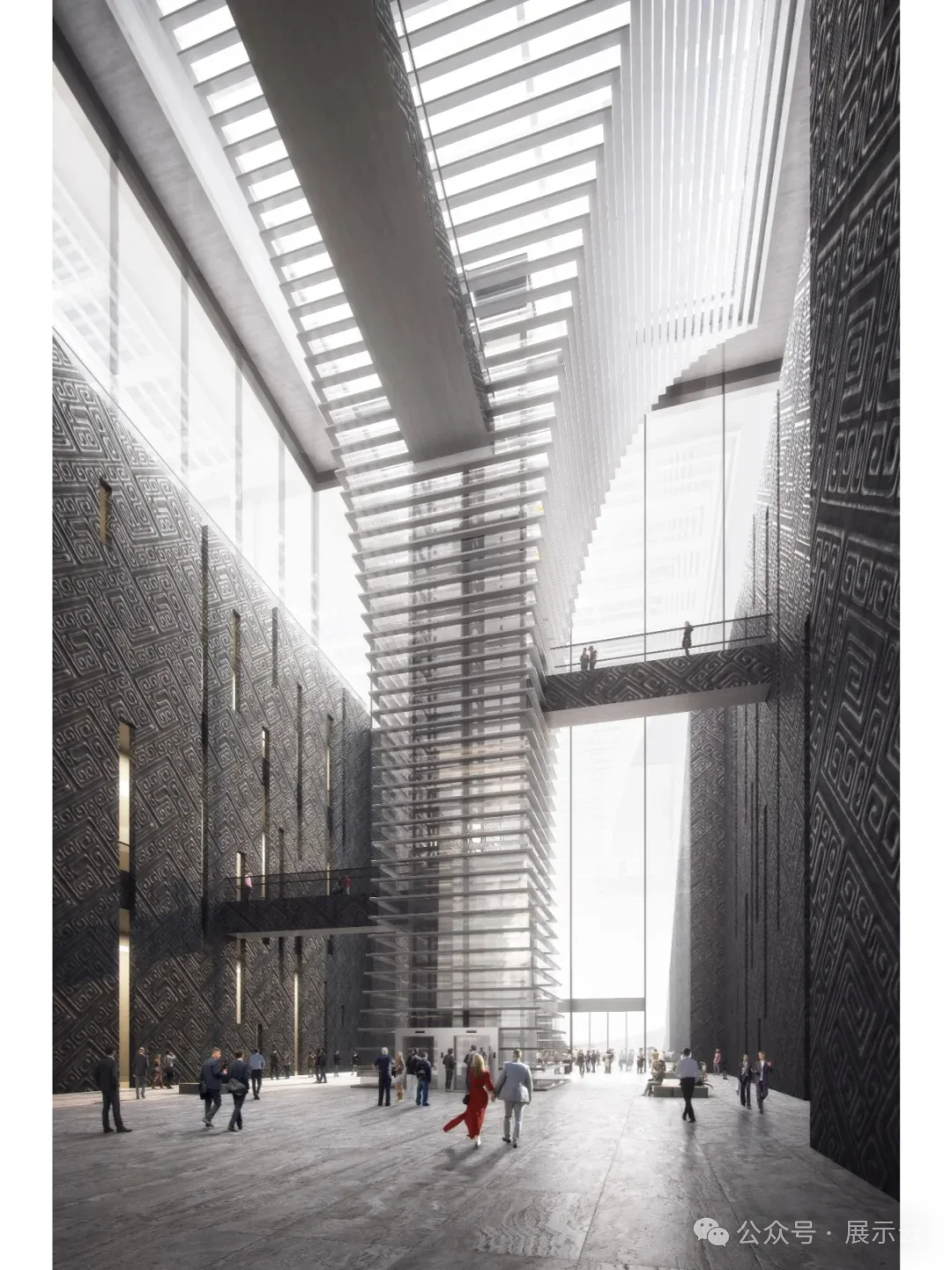 步入秦岭博物馆大厅中央,38米高的“酒尊”造型建筑特别醒目,取形于甲骨文的“商”字。