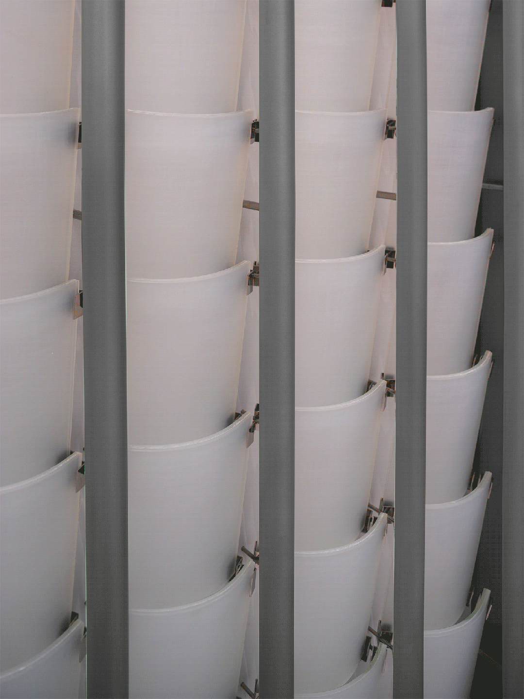 这些瓦片由定制的夹胶玻璃热弯而成,呈现出玉石般的质感,通过隐藏在纵向结构内的灯带,瓦片墙呈现黄绿色的颜色变化。
