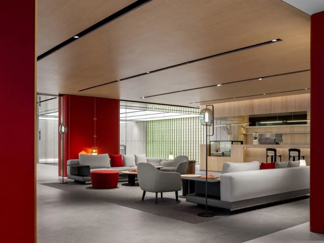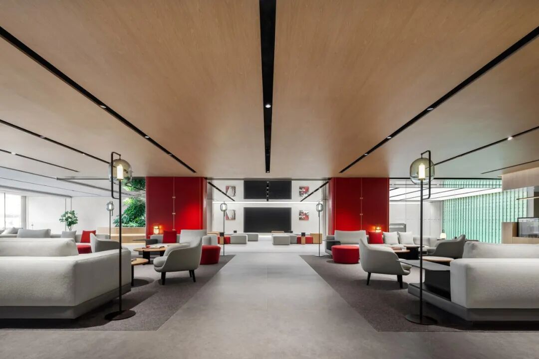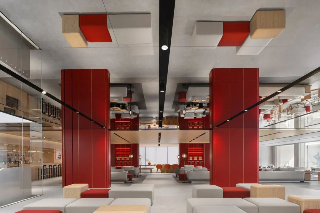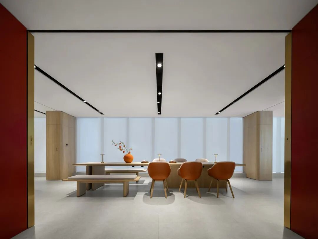 从长桌区看向论坛区。层层递进的功能设置,通过红色的隔断和推拉门平衡了不同使用场景的私密性需求