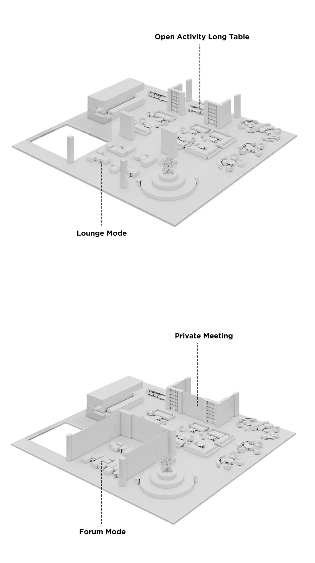 功能分布沿动线从开放到私密的递进,创造了多样的场景:从开放的可变式论坛艺廊空间,到休闲自在的lounge,再到安静独立的阅读空间,旨在平衡空间的私密性与公共性。