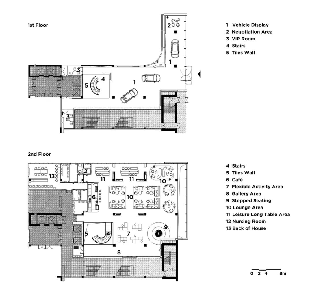 一层作为汽车展厅,整体空间现代简约。大厅前部的镜面天花人为性地纵向扩展空间视觉体量,让步入空间的方式形成延伸、递进的层次变化。