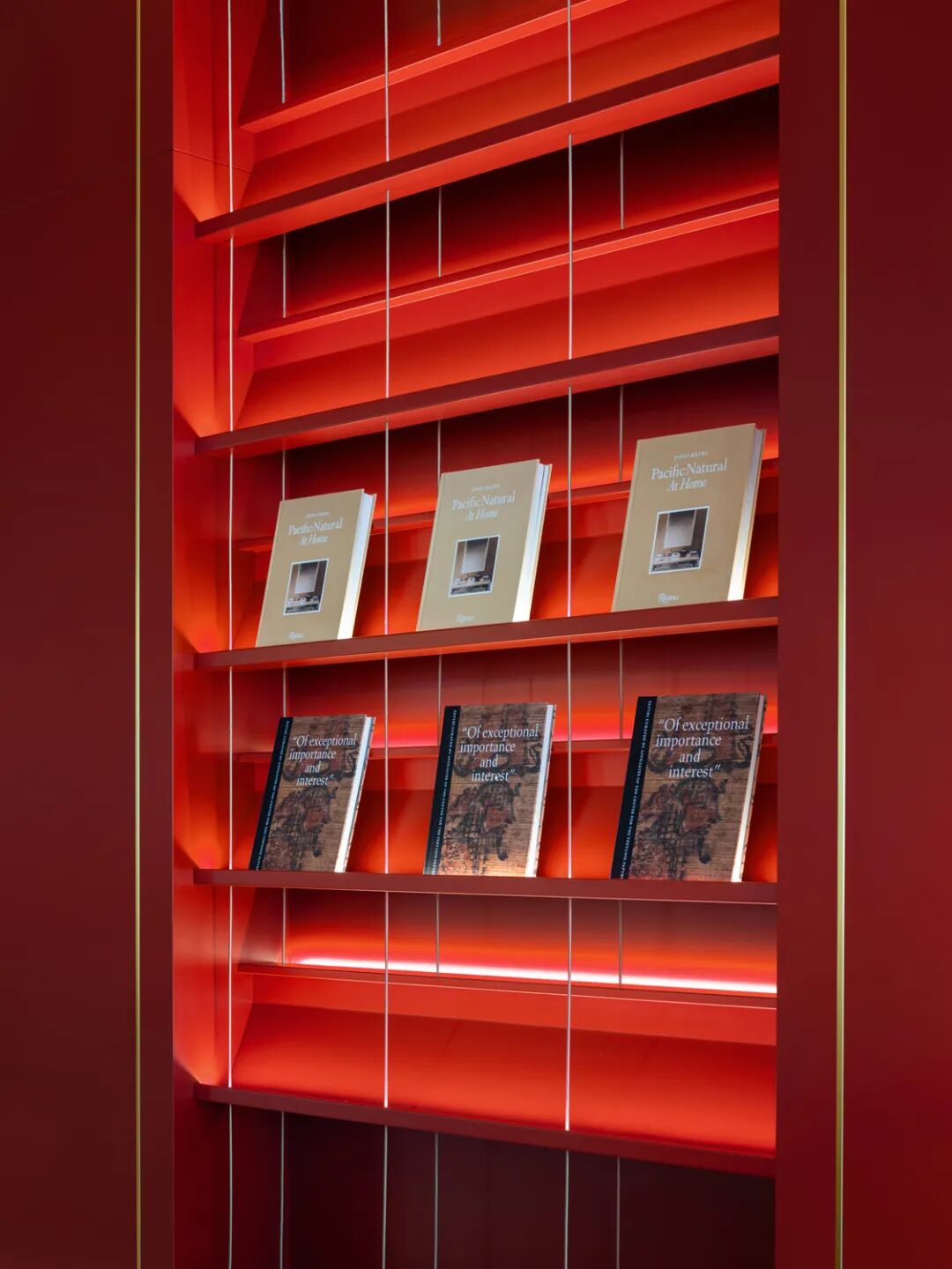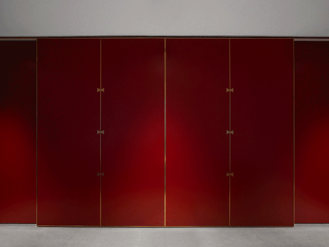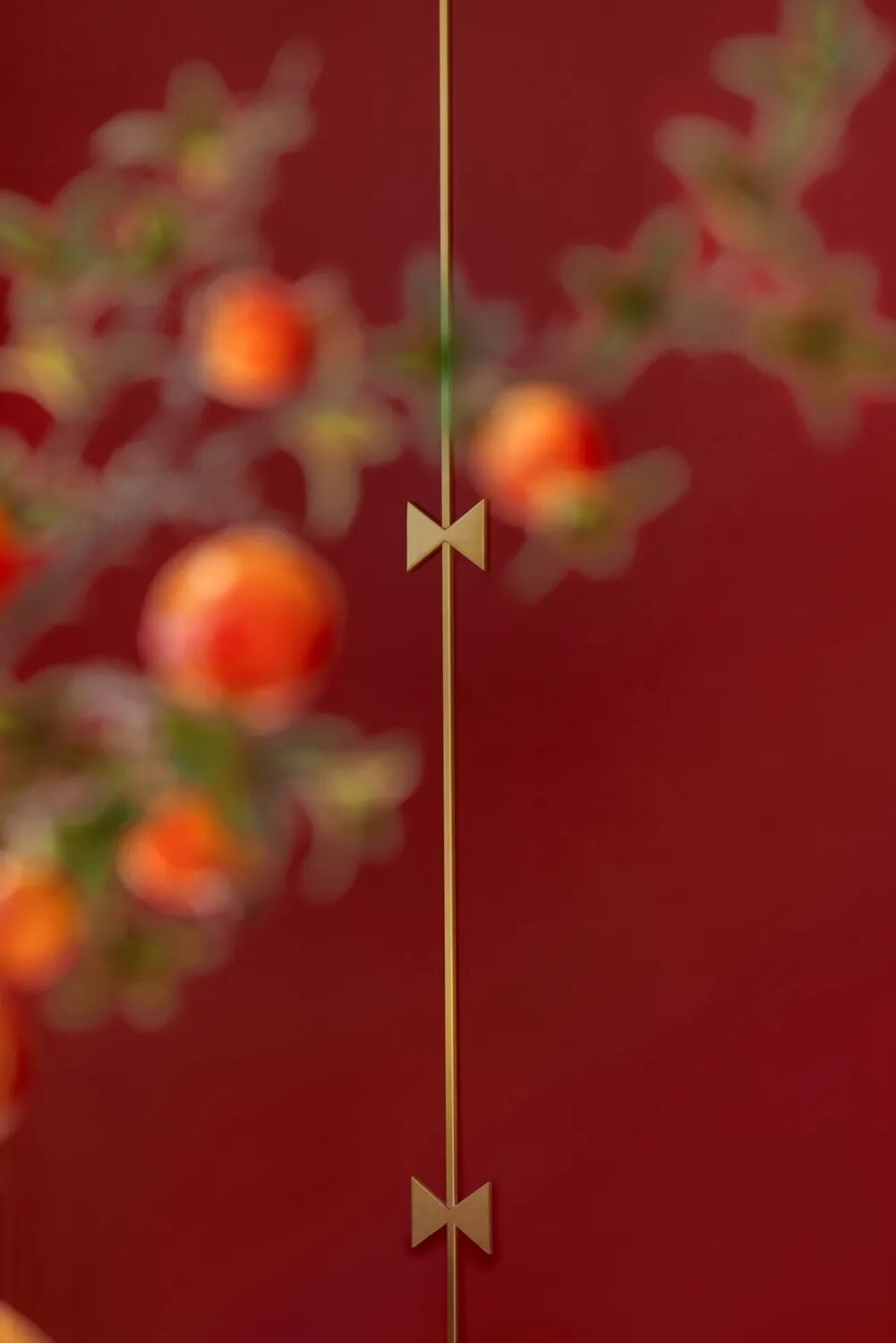 红色墙体上的黄铜榫片则来源于传统的榫卯结构工艺:黄铜制的银锭榫嵌在隔断和家具的板与板之间,使拼接牢固防止开裂。