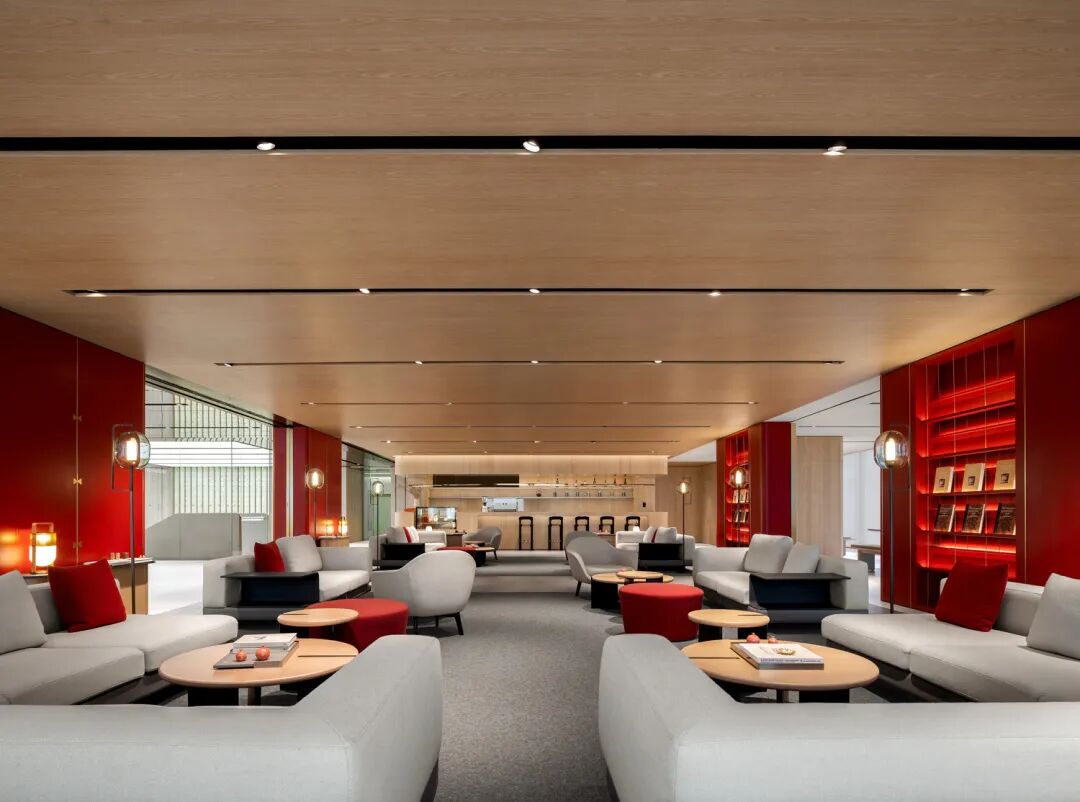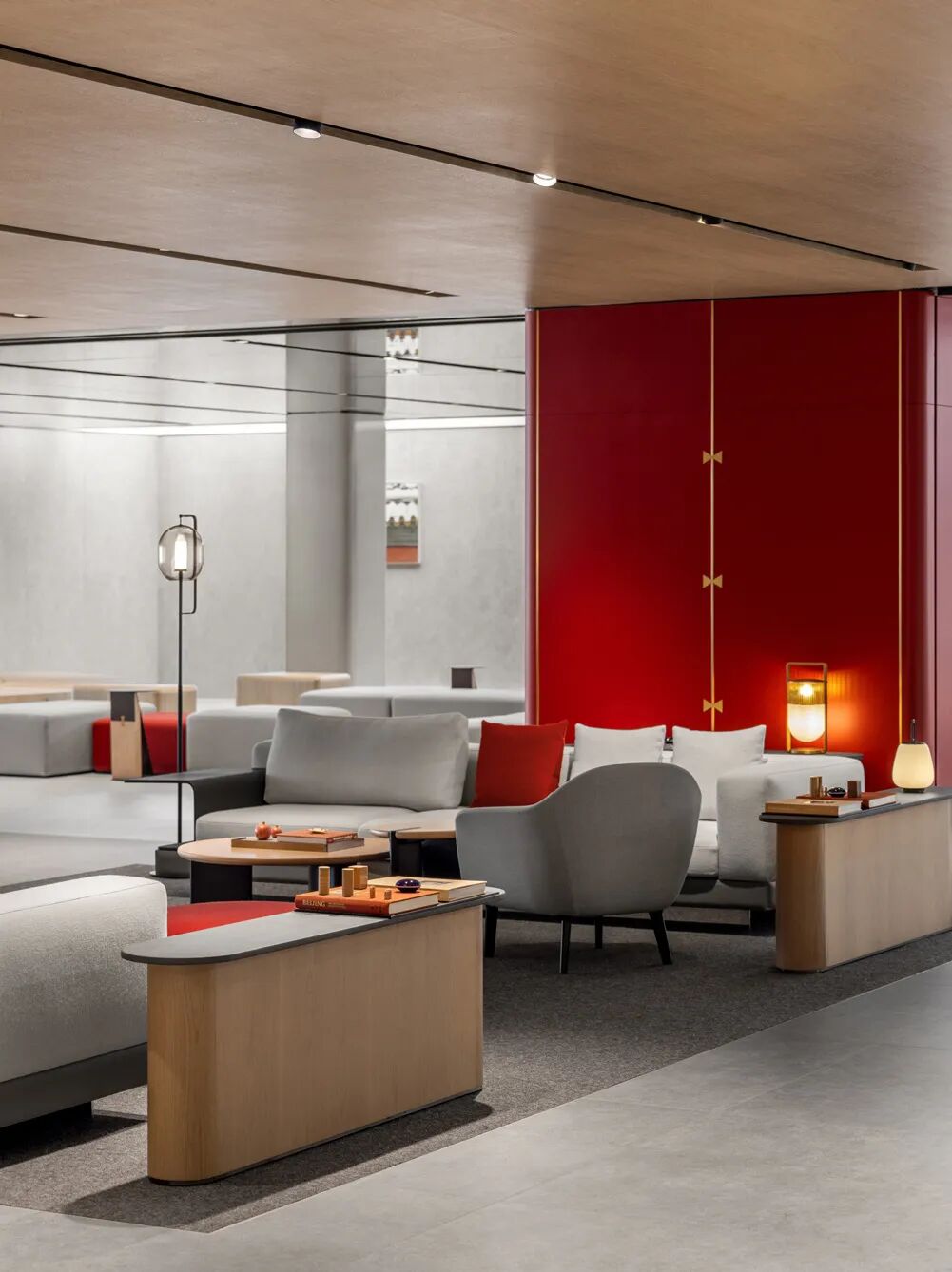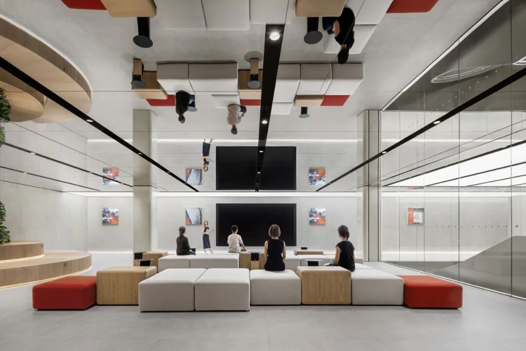 从论坛艺廊区看向休息区,红色墙体划分出功能区同时丰富了空间的层次
