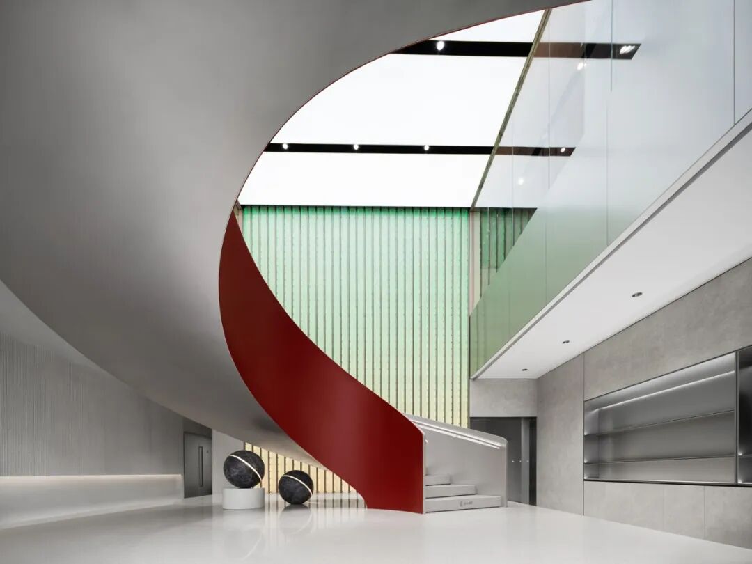 这一设计巧妙地将现代科技元素与传统文化特色结合,既为楼梯增添了现代感,又回应了京城古建筑琉璃瓦的流光溢彩。
