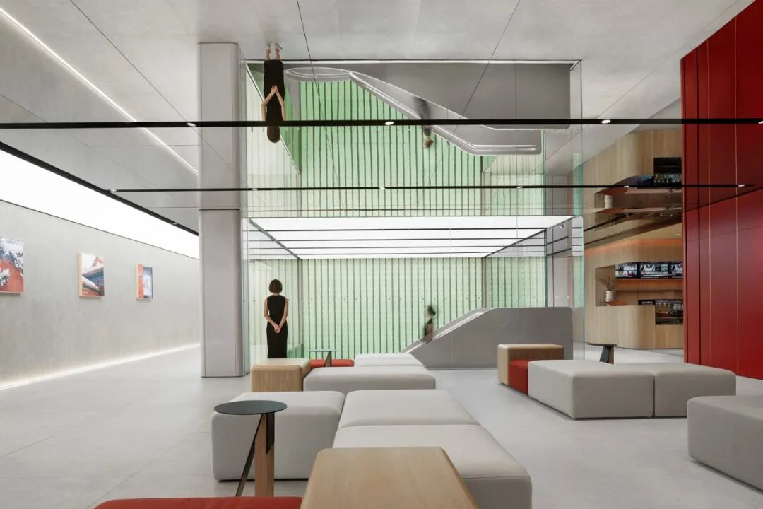 二层空间的红色墙体浸润着古时城市的气息,与黄绿色的琉璃瓦片墙互为映衬,回应“碧瓦红墙”的古都风韵,城市的过去与未来在此相遇。