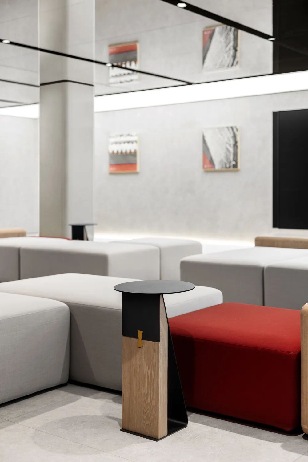 除此之外,设计师还专门为空间定制了带有榫卯嵌片的家具,与红色墙面的黄铜榫片互相呼应。