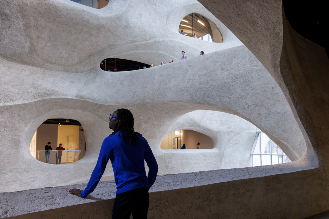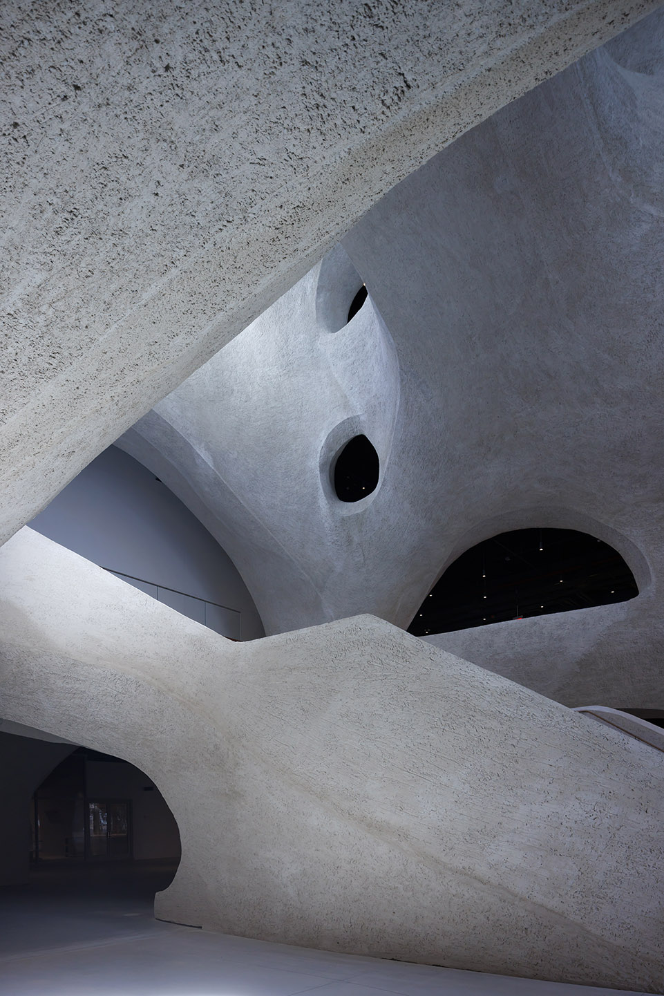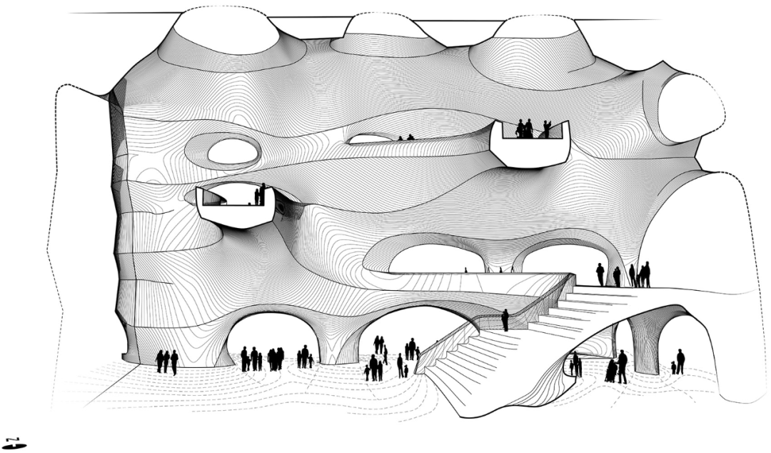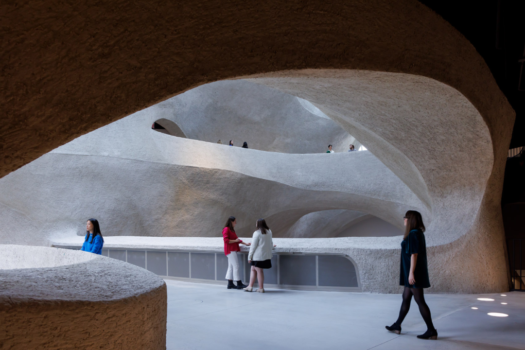 中心的设计灵感源于自然的造型过程,中庭就像是风和水流形成的多孔地质构造,迎接着到达的游客,为他们提供了一个引人入胜的探索空间。中庭的结构使建筑向自然光敞开,为不同的空间带来吸引人的视野,并在它们之间架起了物理的连接桥梁。
