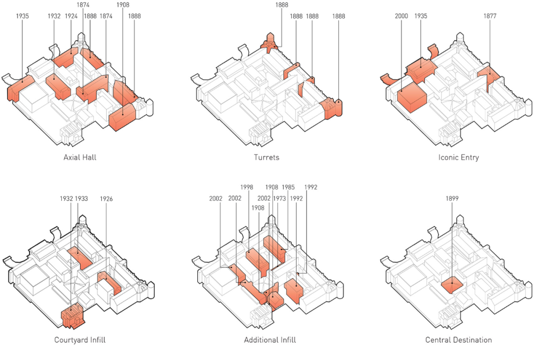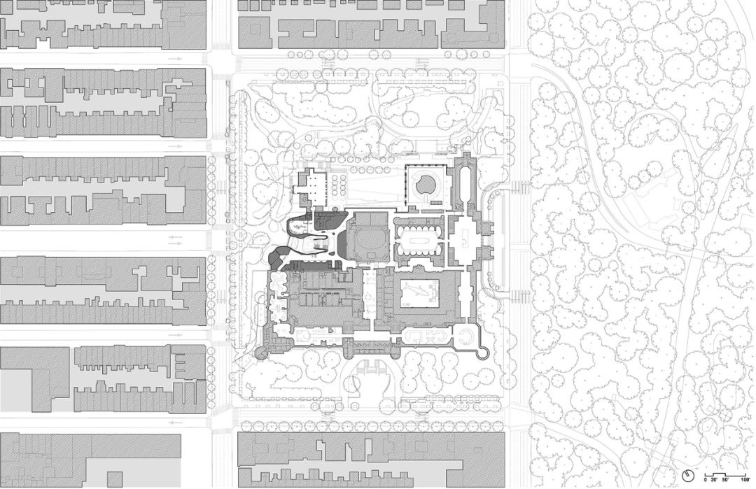 Studio Gang的设计遵循了由内而外的逻辑,通过设置连续的通道将拥有150年历史的既有建筑连接起来,极大地改善了整个博物馆园区的功能性和游览体验。中心项目还引入了一个全新的无障碍入口,创造了一条强有力的东西向轴线,并在10座不同的建筑之间建立了30多个连接点,用连续的环路取代了曾经闭塞的路径。
