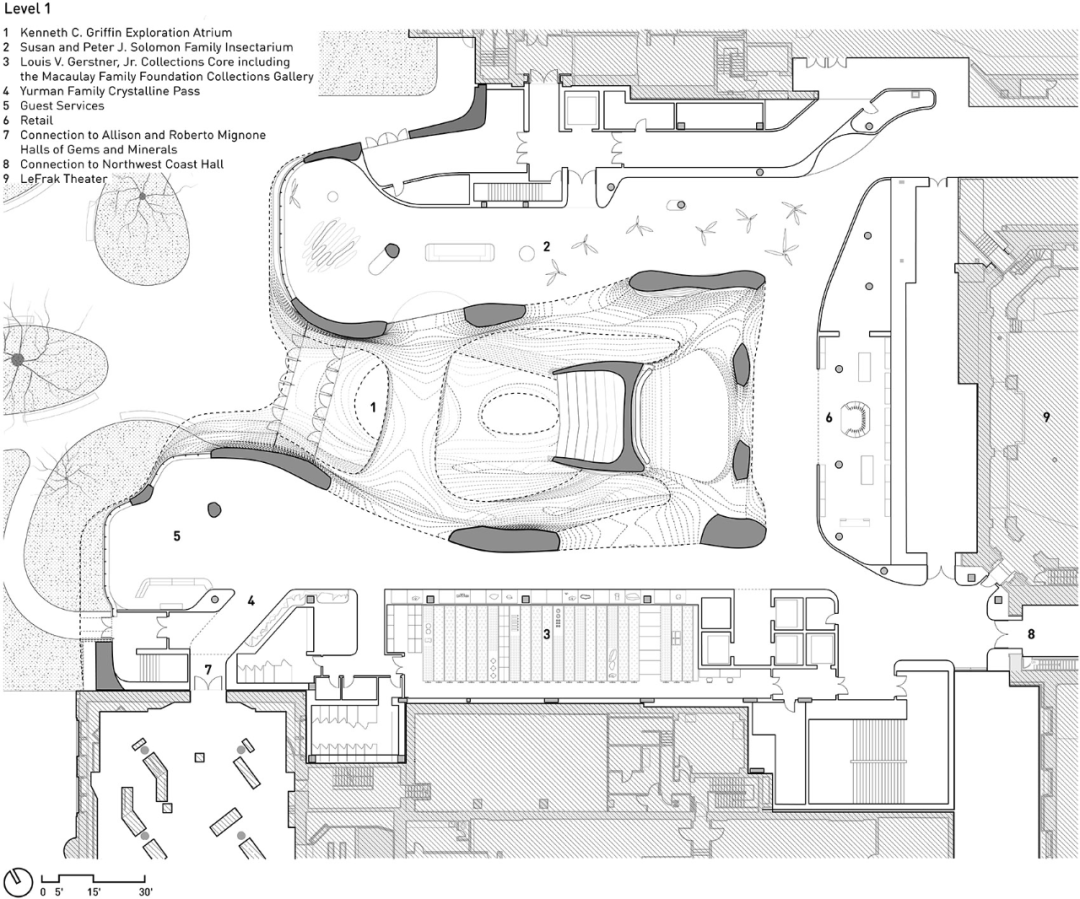 从中庭开始,参观者可以很容易地找到并进入周围的功能空间,这些空间展现了博物馆在科学和教育方面的使命,并将参观者与科学的验证过程联系在一起。新增加的展览空间包括昆虫馆、蝴蝶馆、收藏中心等,以及一个名为“看不见的世界”的沉浸式空间,展示了地球上的所有生命如何联系在一起。此外,中心还设有图书馆、教室、学习实验室和教育区域,旨在为不同群体提供服务。