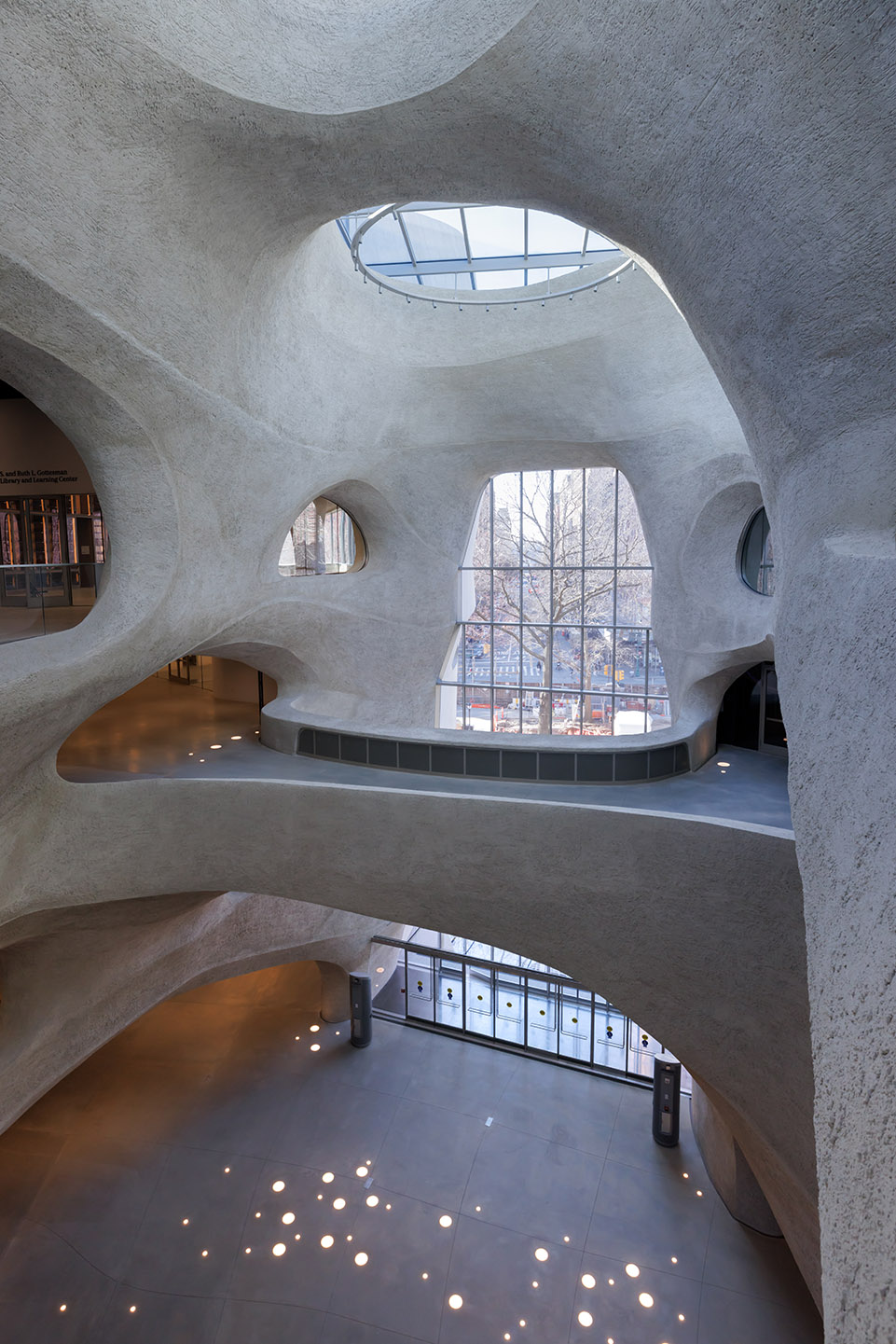 吉尔德中心的开放标志着博物馆在提高民众科学素养方面迈出了重要的一步,同时也向参观者展示了博物馆应有的使命,激发了他们的好奇心与求知欲。这个被公园环绕的建筑,与两侧既有的博物馆建筑保持了高度的一致性,采用了流畅而柔和的曲线造型,与中央公园西入口区域采用了同样的石材,形成了视觉上的连接。