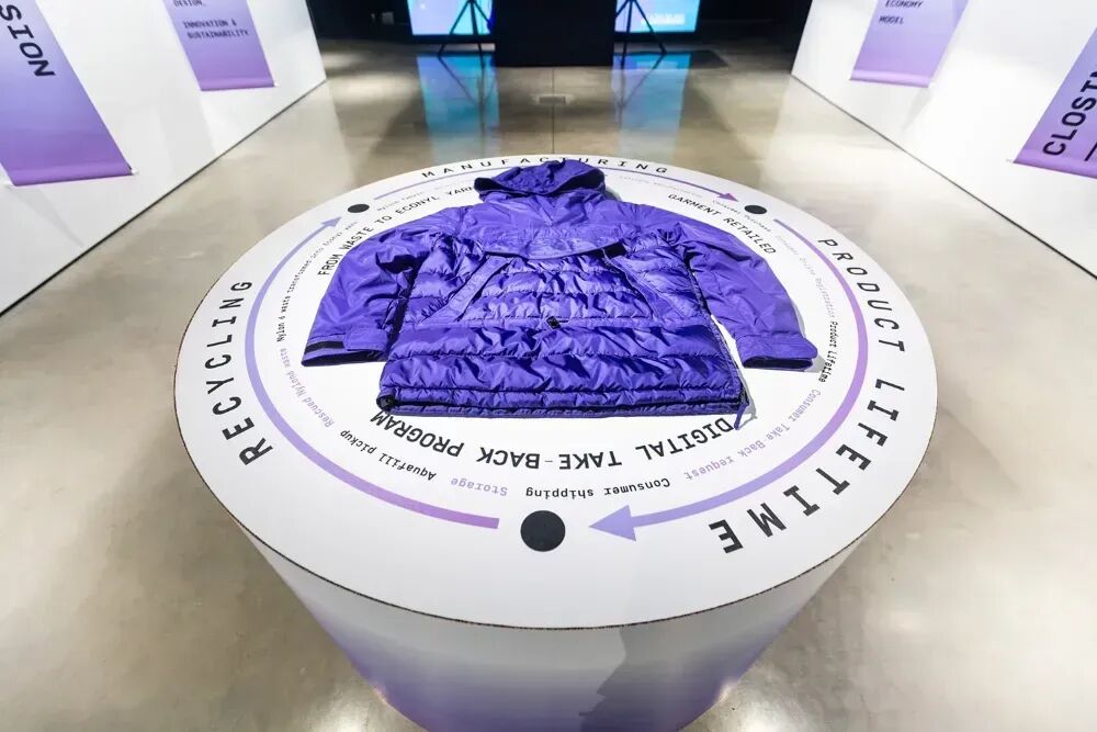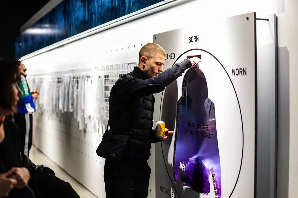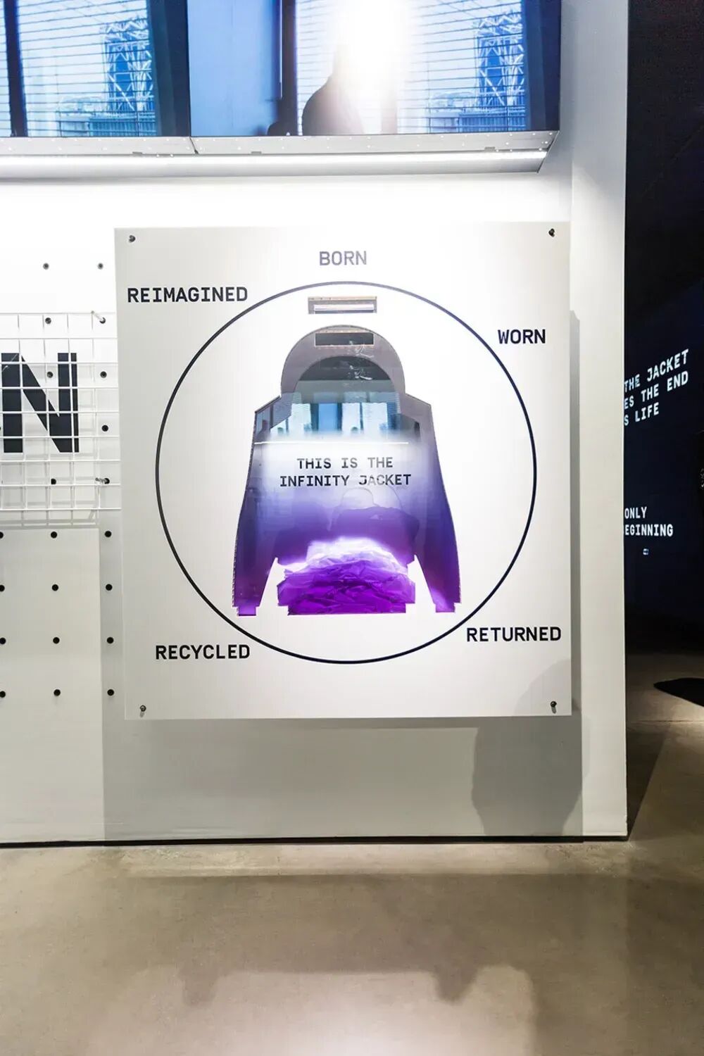 为了庆祝这件夹克的问世,StudioXAG在一个500平方米的场地中设计了一个颇具影响力的沉浸式品牌展览空间,并邀请媒体、批发商、零售商以及各界精英参与其中。在展览中,受邀人士可以通过这件可回收的外套,抢先了解和探索无限夹克背后的可持续性创新手段。为了与夹克传达的可持续概念保持一致,StudioXAG决定使用一系列对环境影响较小的材料,如硬纸板和纸等,来塑造活动空间。悬浮的Econyl®可再生尼龙条带构成了一个宽敞的互动式空间。该空间通过故事性的叙述,鼓励参观者用手去感受材料并了解无限夹克的生产过程。