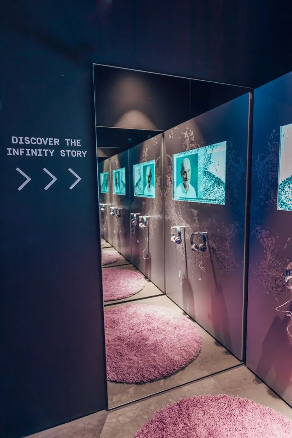 体验室内设有各种颜色的光带、直射光线和反射光线,参观者们可以站在镜面的前方,一边感受“无限”这个主题一边自拍。知识展亭中播放着各种引人深思的电影和动画,以便于参观者能够深入了解夹克的设计理念和创新性思维,以及Napapijri与Econyl®品牌之间的合作关系。
