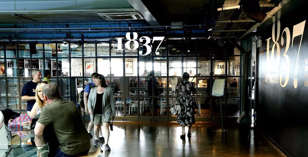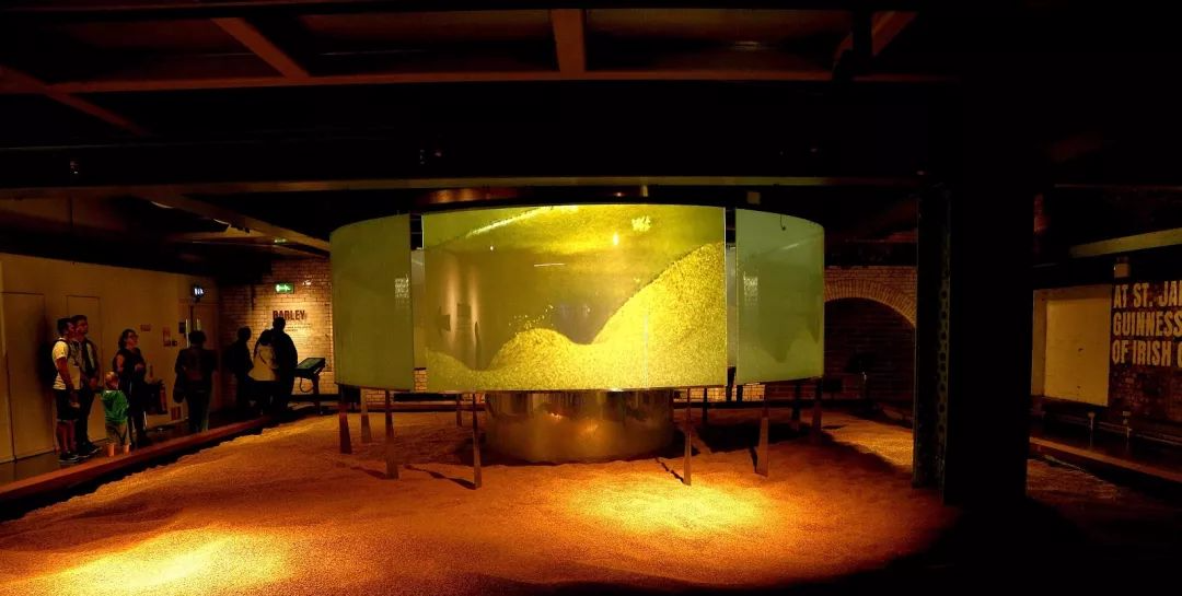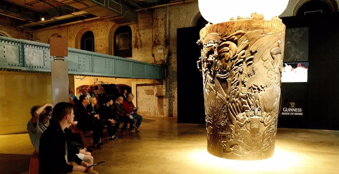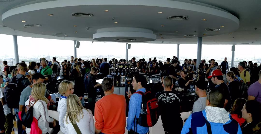 ### 啤酒中心 随着吉尼斯品牌越做越大,这座1904年启用的老啤酒厂早已搬迁,七层楼高的建筑被改造成集展览、饮食、娱乐与零售于一身的大型博物馆,每年有60多万人前来参观,英国女王伊丽莎白二世也曾到访。 最顶层七楼是整趟旅程的高潮——健力士官方酒吧 Gravity Bar。 游客凭当天参观券,可以免费领取一杯新鲜黑啤畅饮。