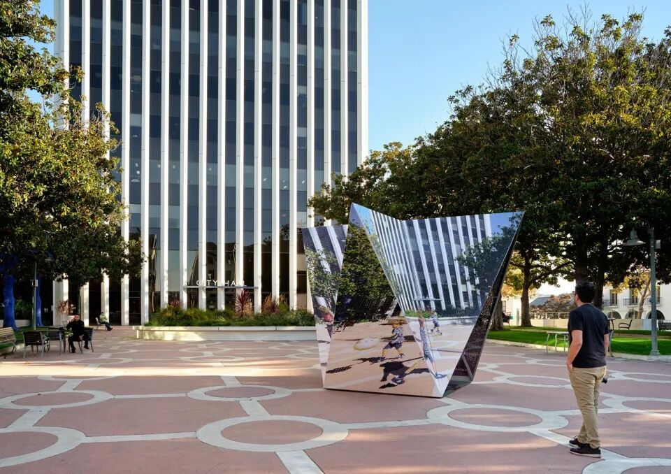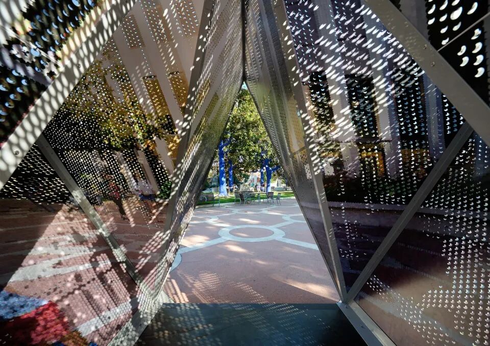 Cache Me if You Can艺术装置位于帕洛阿尔托市政厅前的国王广场。装置的内部和外部共有20个印有图像的表面,它描绘了2019年5月31日这一天广场上发生的事件,同时呈现出变化的光影。