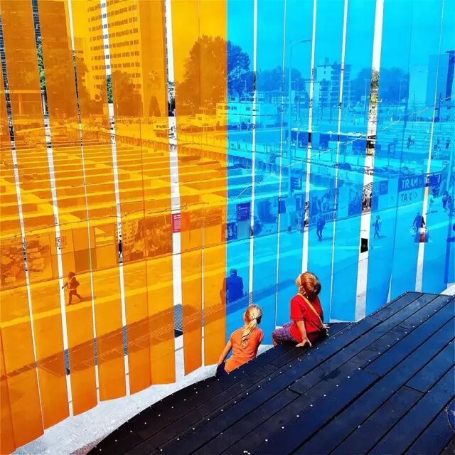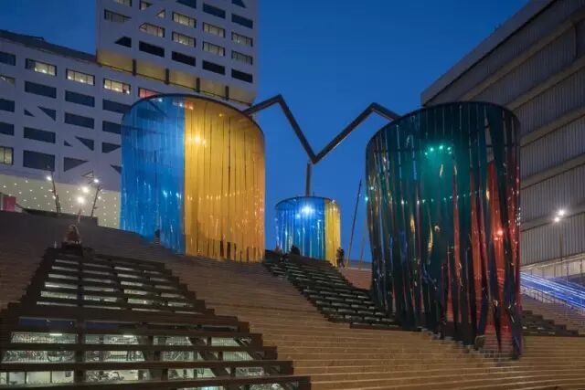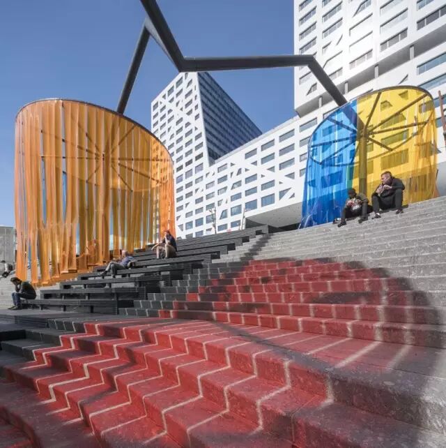 “Aura utrecht”公共装置位于荷兰乌特勒支市,装置由三个分离的圆柱结构组成,并通过高耸的支架连接。三个结构垂下透明的彩色挂帘,处在装置内部,街道被透明挂帘染成鲜活的色彩,而在外部,装置就像是街道令人注目的舞台,成为城市街道充满活力的场地,也是城市中心的一块让人平静的绿洲。