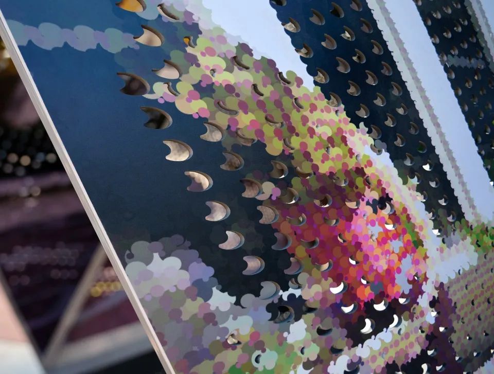 三角形板面上的孔径形成变化的图案,到了晚上,装置从内部点亮,光线从这些孔径散发出来,在广场上投下一组新的图像。