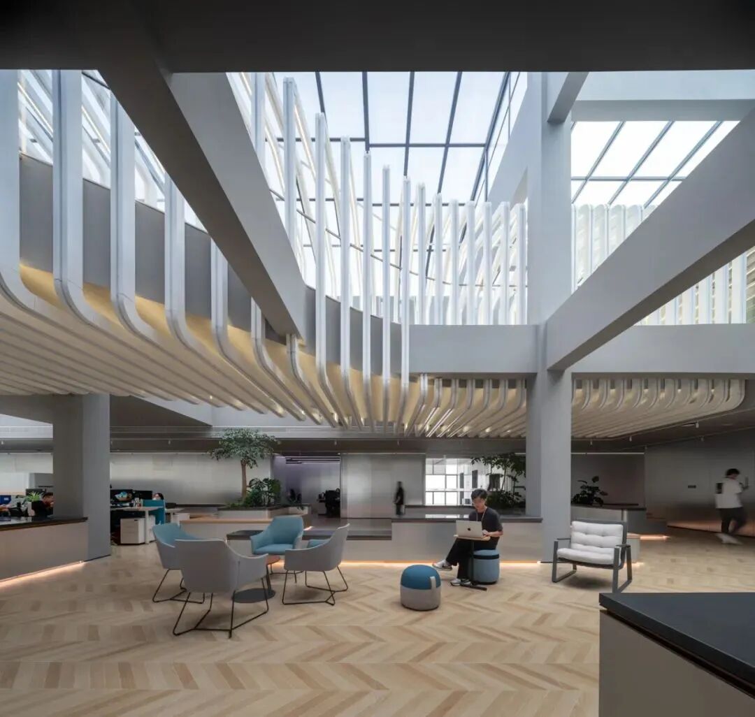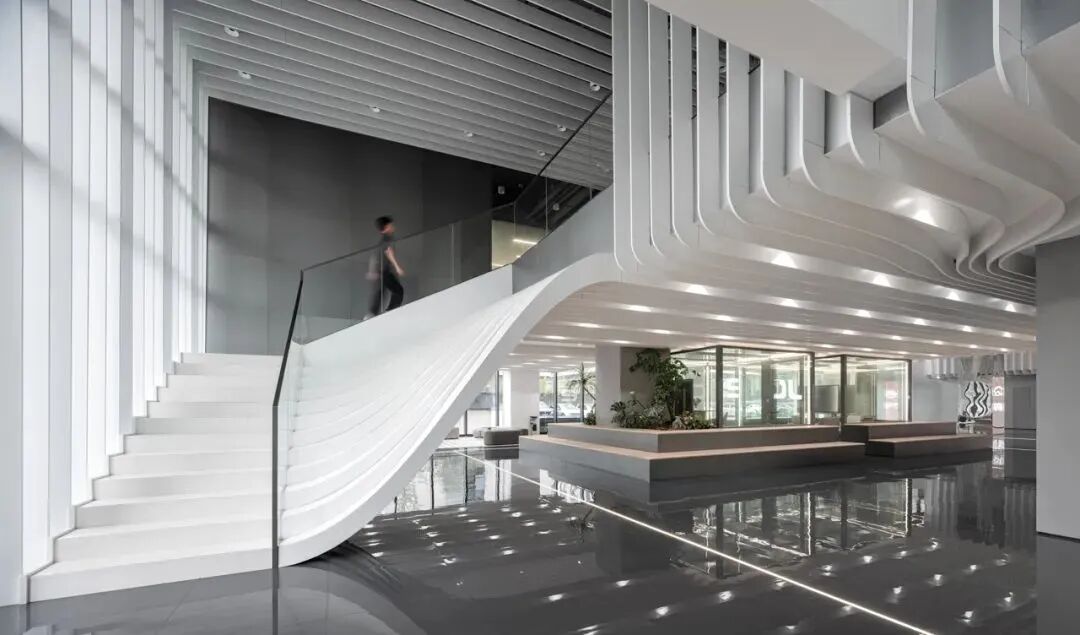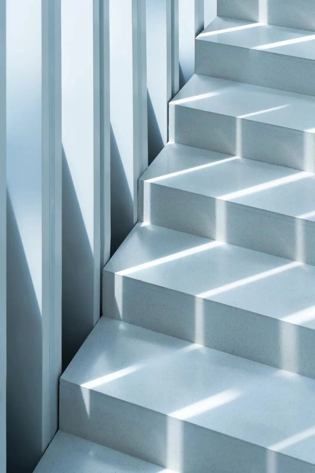 云梯采用竖向白色要素构成,阳光洒在格栅之上,形成明朗,秩序的空间感,随着日升日落,景象随之不同,让员工得以在工作间隙让头脑彻底放松,也成为企业独一无二的标志性的身份特征。