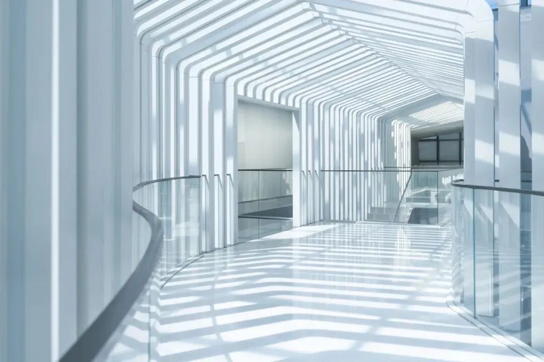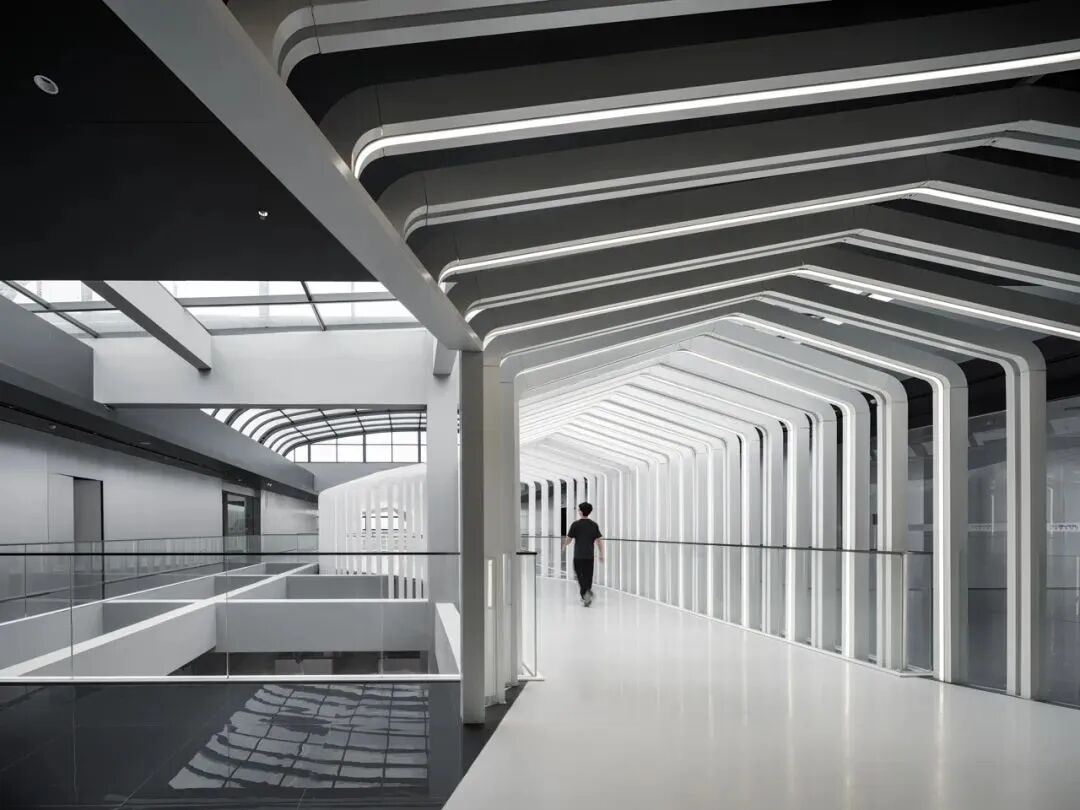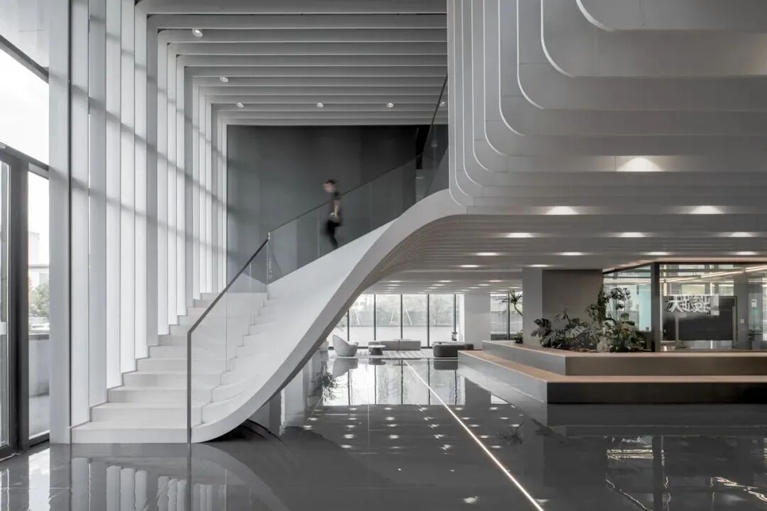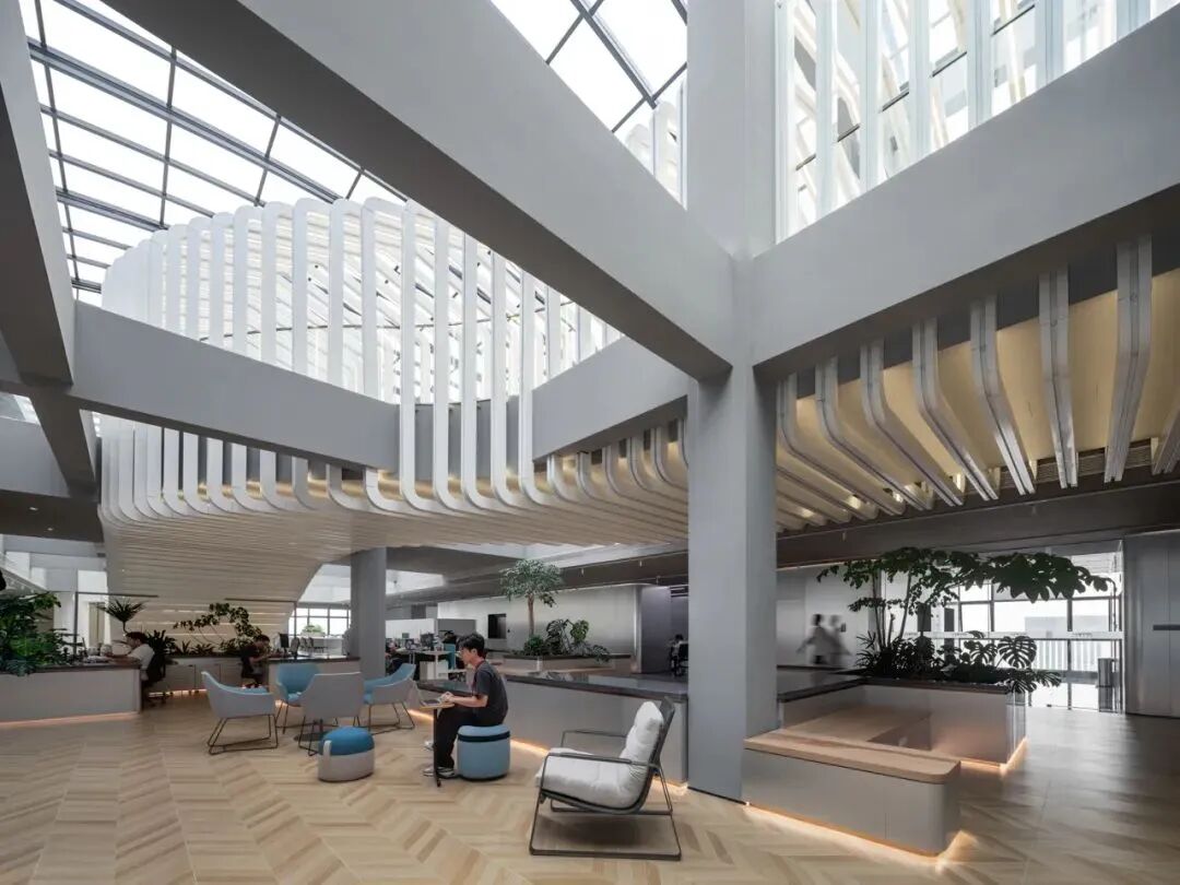 云梯采用竖向白色要素构成,阳光洒在格栅之上,形成明朗,秩序的空间感,随着日升日落,景象随之不同,让员工得以在工作间隙让头脑彻底放松,也成为企业独一无二的标志性的身份特征。