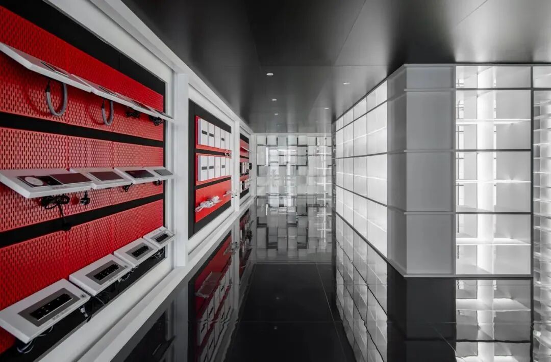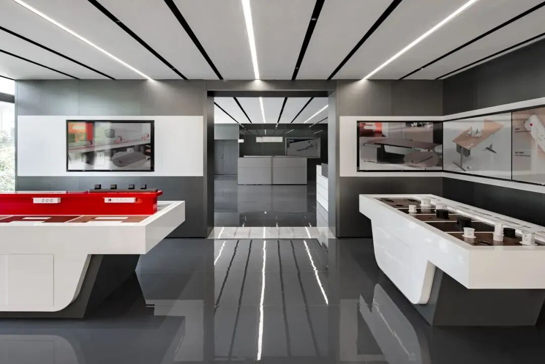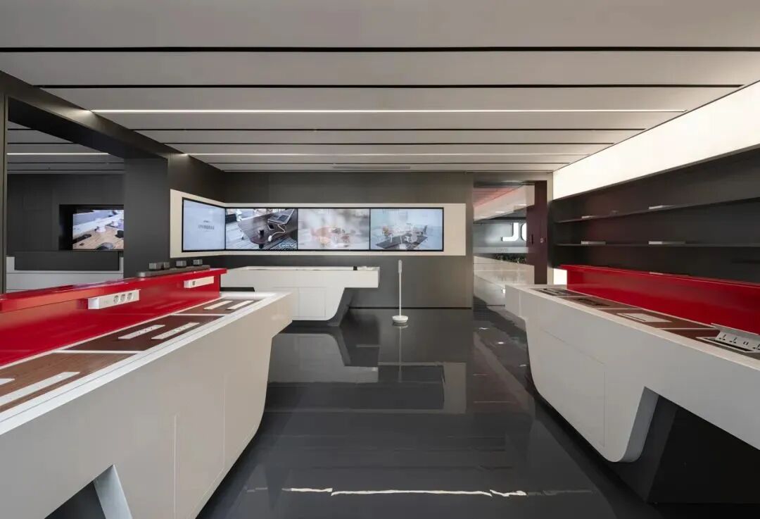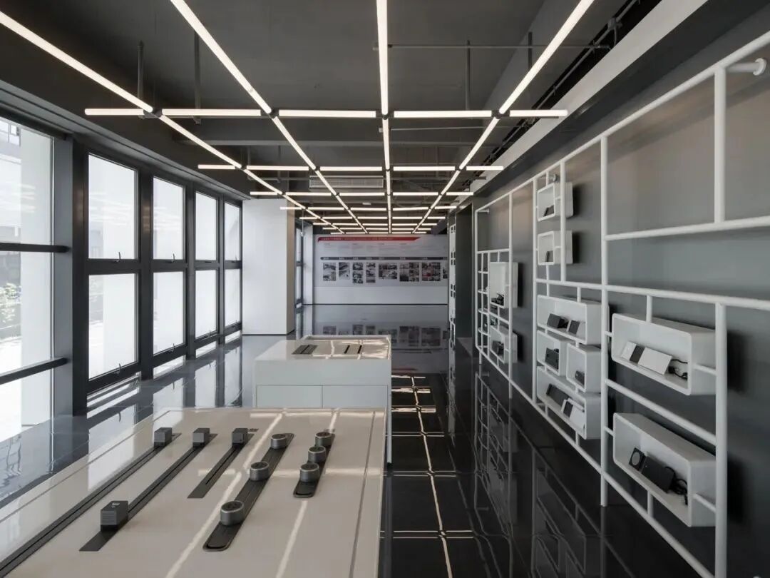 一层展厅空间由产品展厅开始,展厅通过网格,线性等手段,将空间分割,骏跃的电气化产品位于空间矩阵的各个节点上,中间的展示台提供讲解场景。产品展区之后,为场景化展示,仿佛穿梭平行空间一般,展现了骏跃解决方案的各个维度,从家居、办公、教育、医疗等场景展示了骏跃丰富的产品光谱。