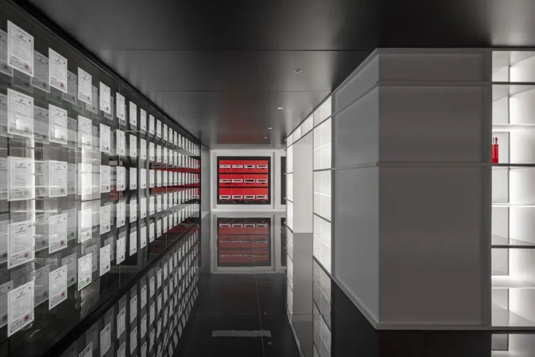 不同于一层展厅的空间并置,二层展厅则采用时间为线索,荣誉展厅仿佛一座黑盒一般收纳了企业过去的荣誉。