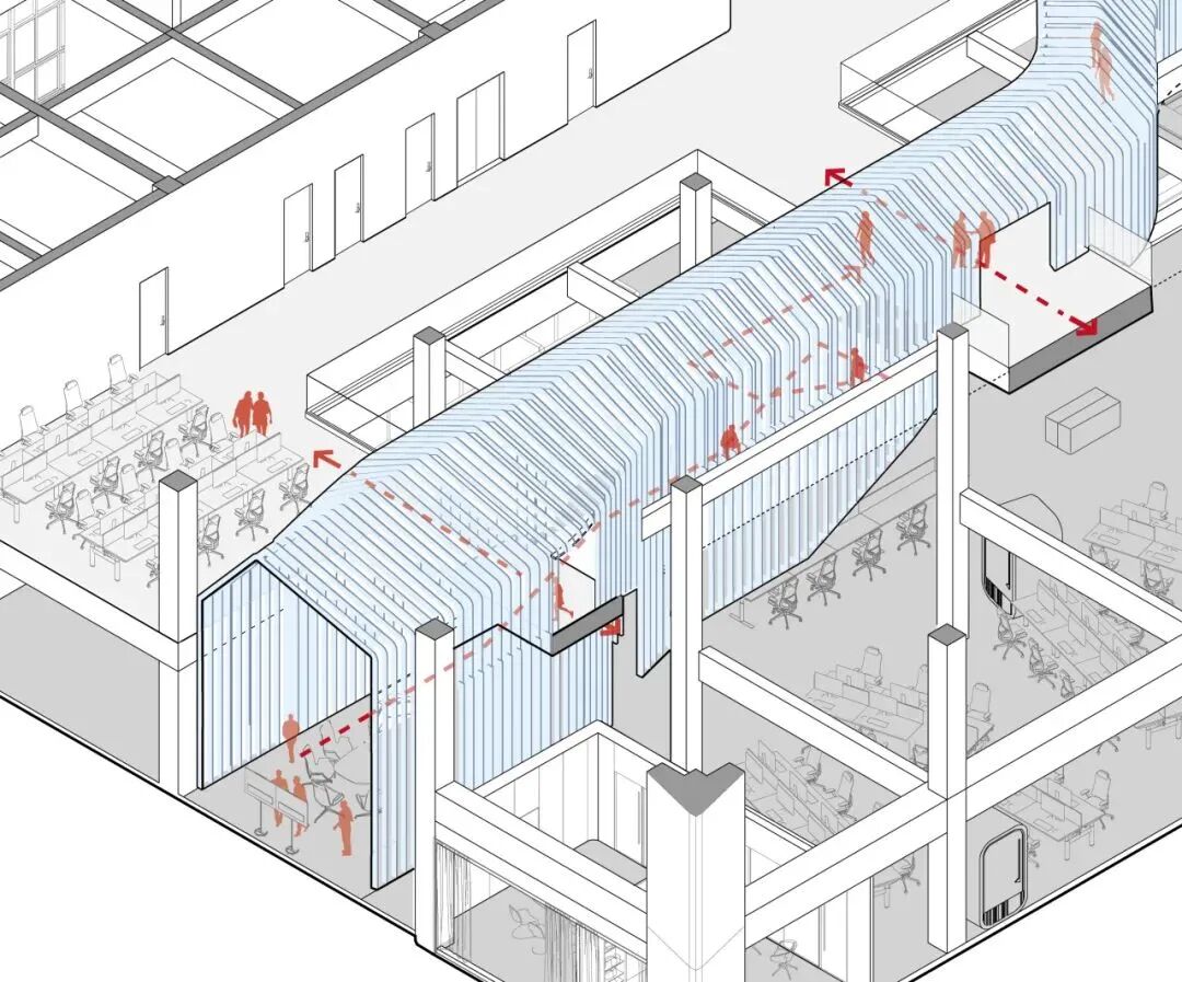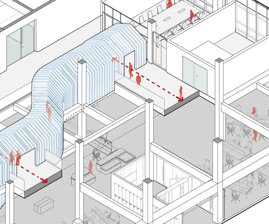 在中庭中央,建造了一座贯通两层的巨型云梯游廊,模糊两层办公区的界限。游廊两端为两座讨论区,茶水间,打印室,讨论区围绕楼梯布置。