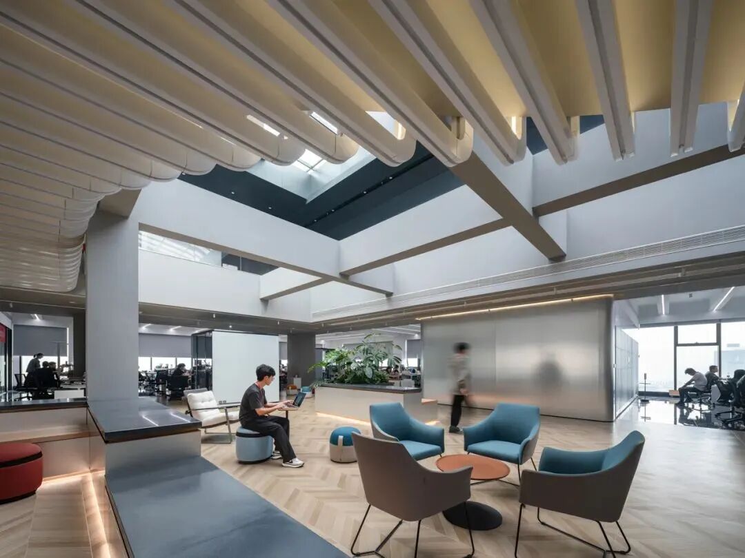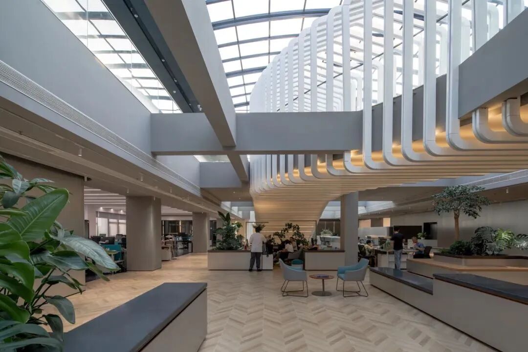 位于9-10层的办公区同样围绕一座两层通高的中庭展开,项目原平面采用偏置核心筒方案,办公平面核心区采光较差,设计打开两层楼板引入一座可电动打开的天窗,形成一座阳光和新鲜空气的活力中庭。