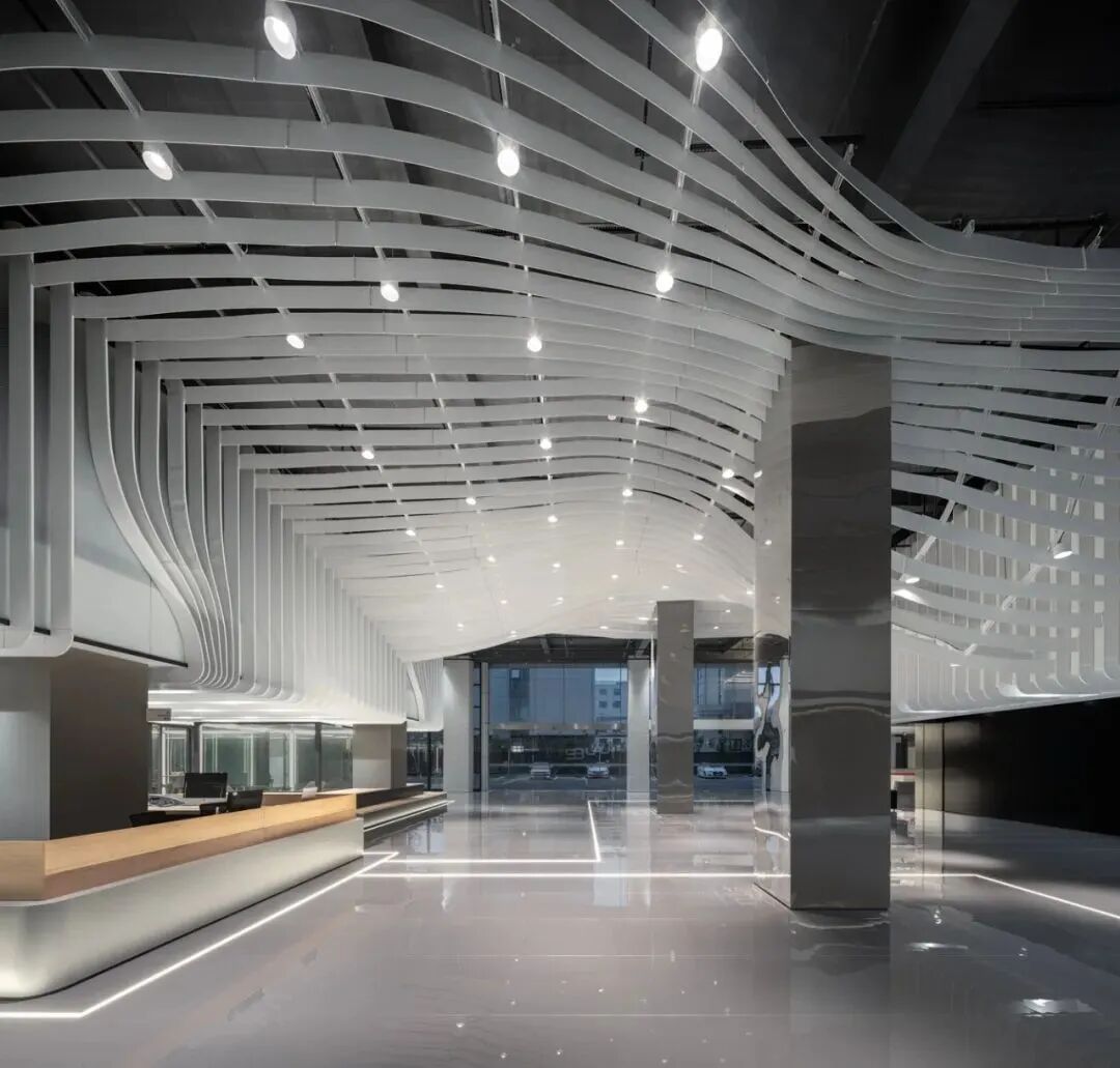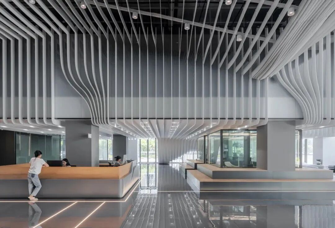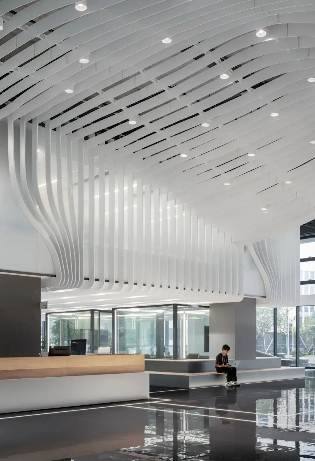 入口大厅围绕一座两层高的中庭展开,设计用低垂的卷积云,将中庭两端的展厅与会议区连接到一起,洁白如雪的云朵从天花板上缓缓垂下,丝丝缕缕,如轻纱般飘逸,形成大尺度环抱式的标志性整体形象。