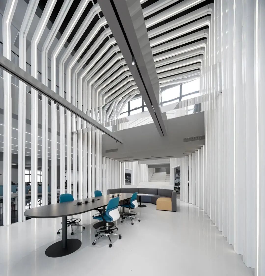 会议区通过低垂的云梯拾阶而上,白色线性元素模糊了天花板、墙壁、楼梯,将常规要素一体化,创造打破常规创新的空间氛围。