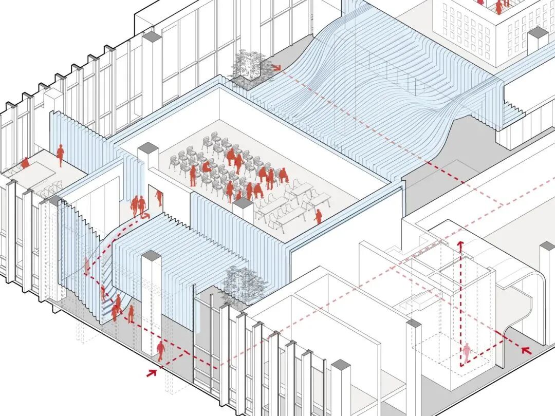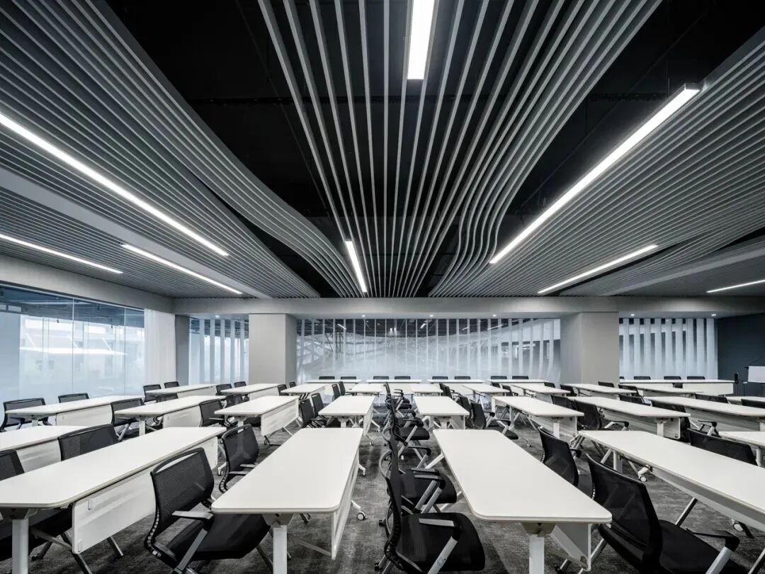 一层围绕两个封闭玻璃会议室设置开放式休息区,展现出开门迎客的姿态。二层设置中大型多功能厅,格栅、玻璃、台阶座位,虚实之间形成微妙的悬浮感。