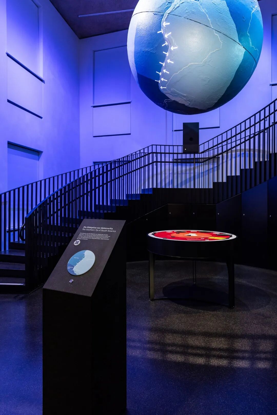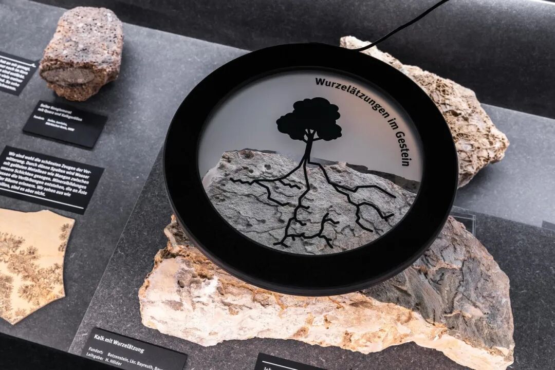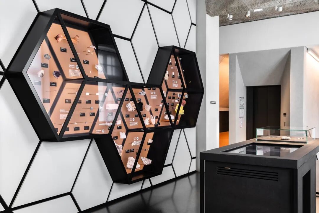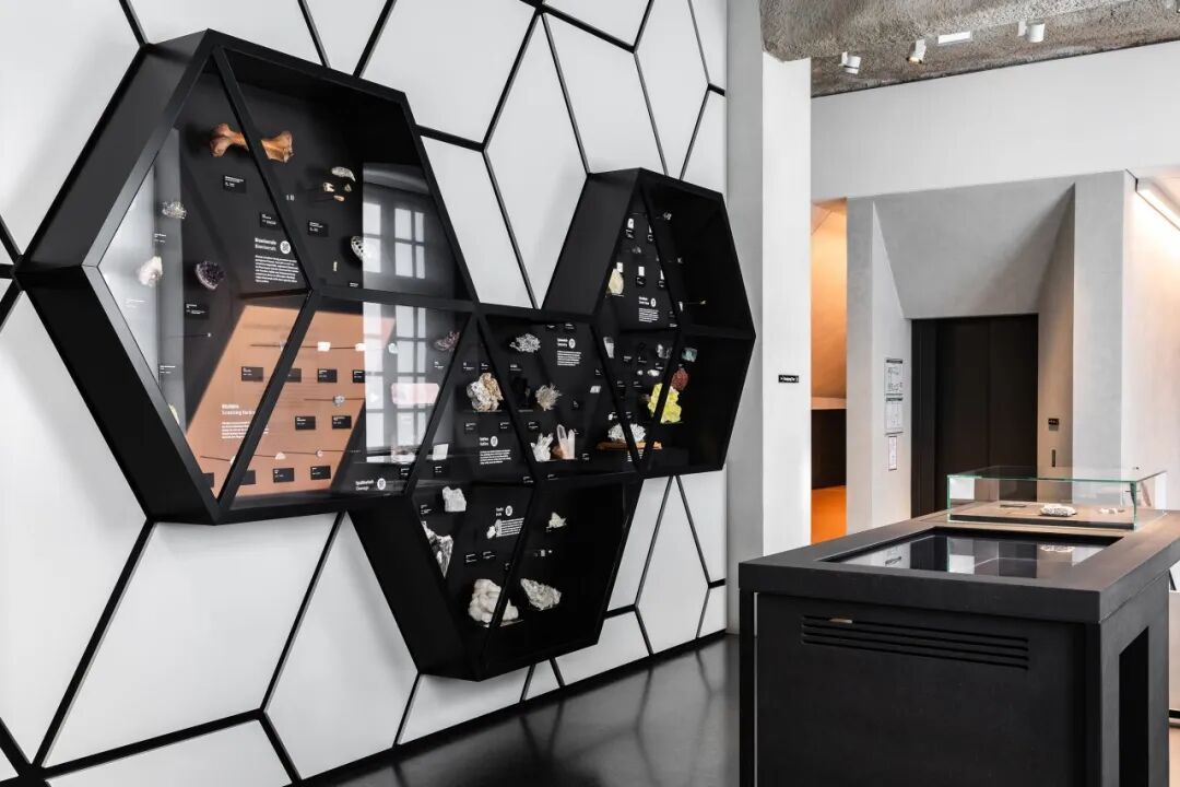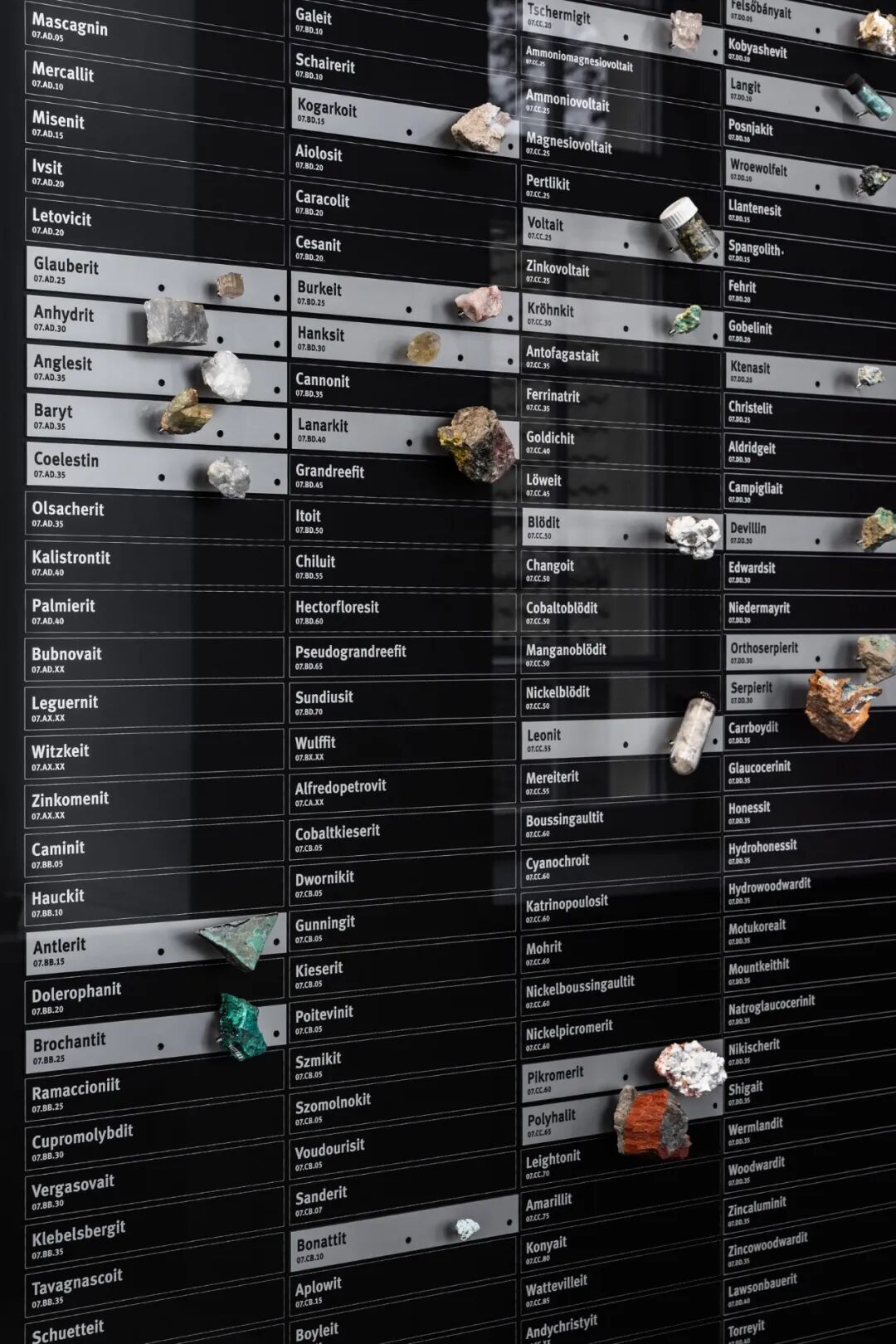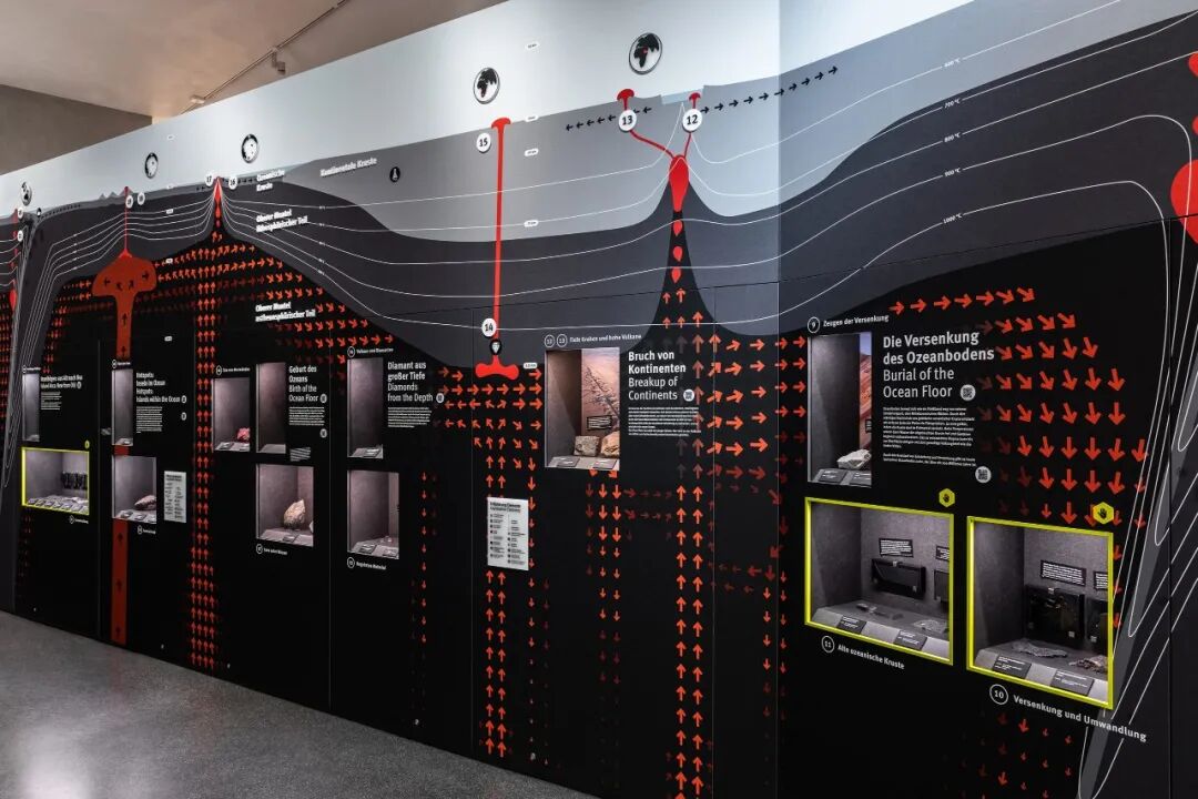 一个17米长、落地式、可扩展的大型展示柜系统地呈现了5000多种矿物名称和精选矿物。“地球的力量”展区以同样令人印象深刻的方式贯穿整个展览:全面而详细的图形、动手实践的物体、集成的展示和媒体传达了有关地幔的令人兴奋的信息。在“地球的力量”面前,一个三维的、明亮的地球仪漂浮在黑暗的太空中,展示了地球板块的构造。