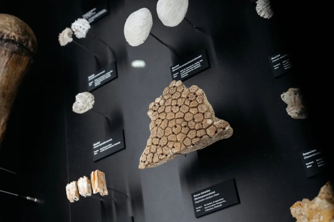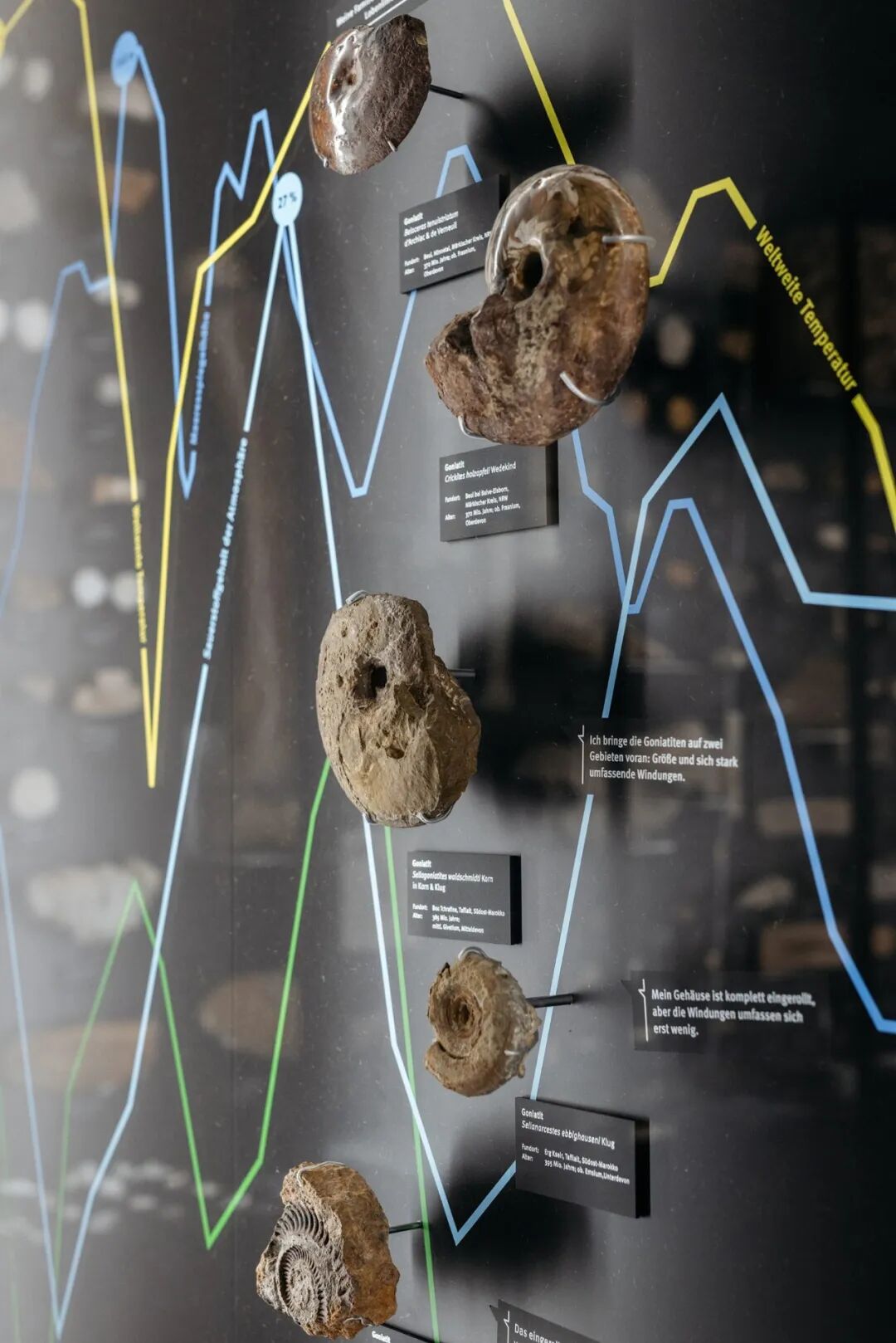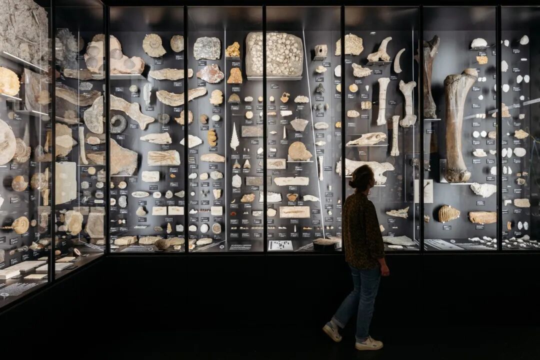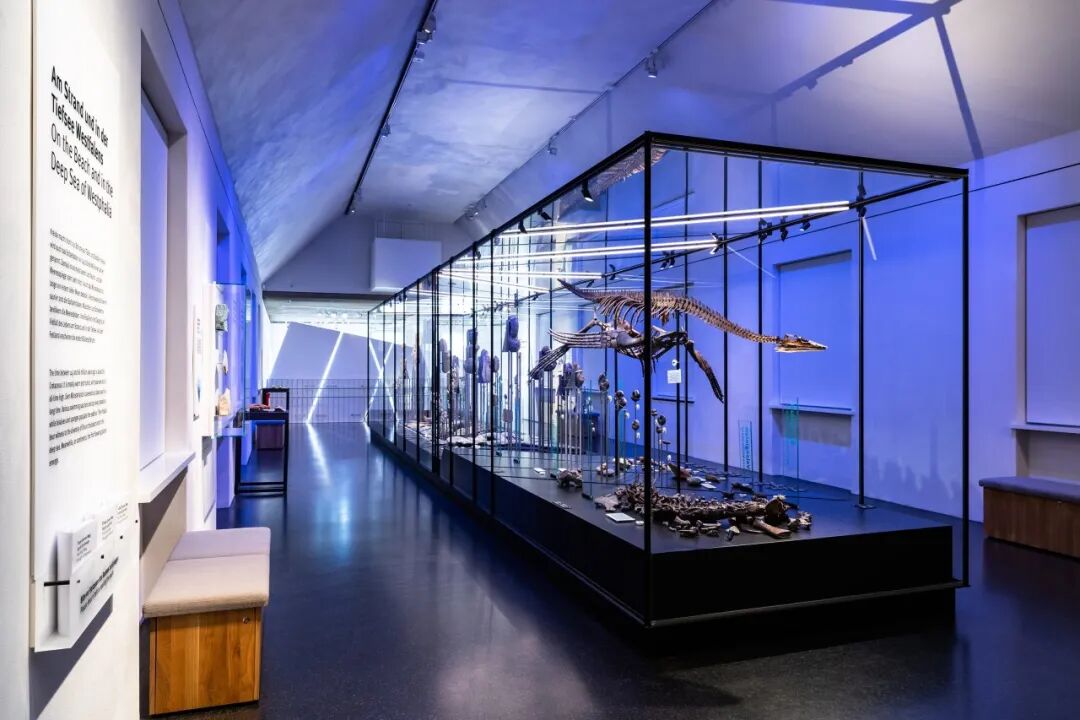 宽敞的陈列柜中精心布置了白垩纪时期的展品,让游客仿佛沉浸在威斯特伐利亚的深海之中。从地板到天花板的展示将游客包围在黑暗的“地球历史室”中,最小的空间里展示了500多件展品,从精致的贝壳到巨大的化石,应有尽有。