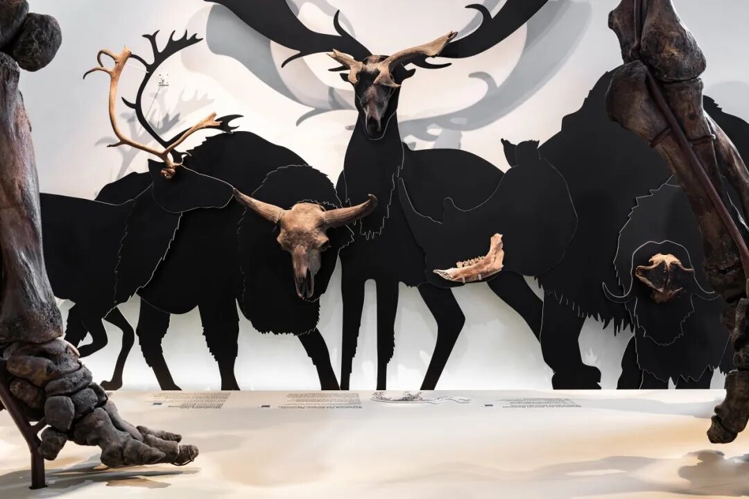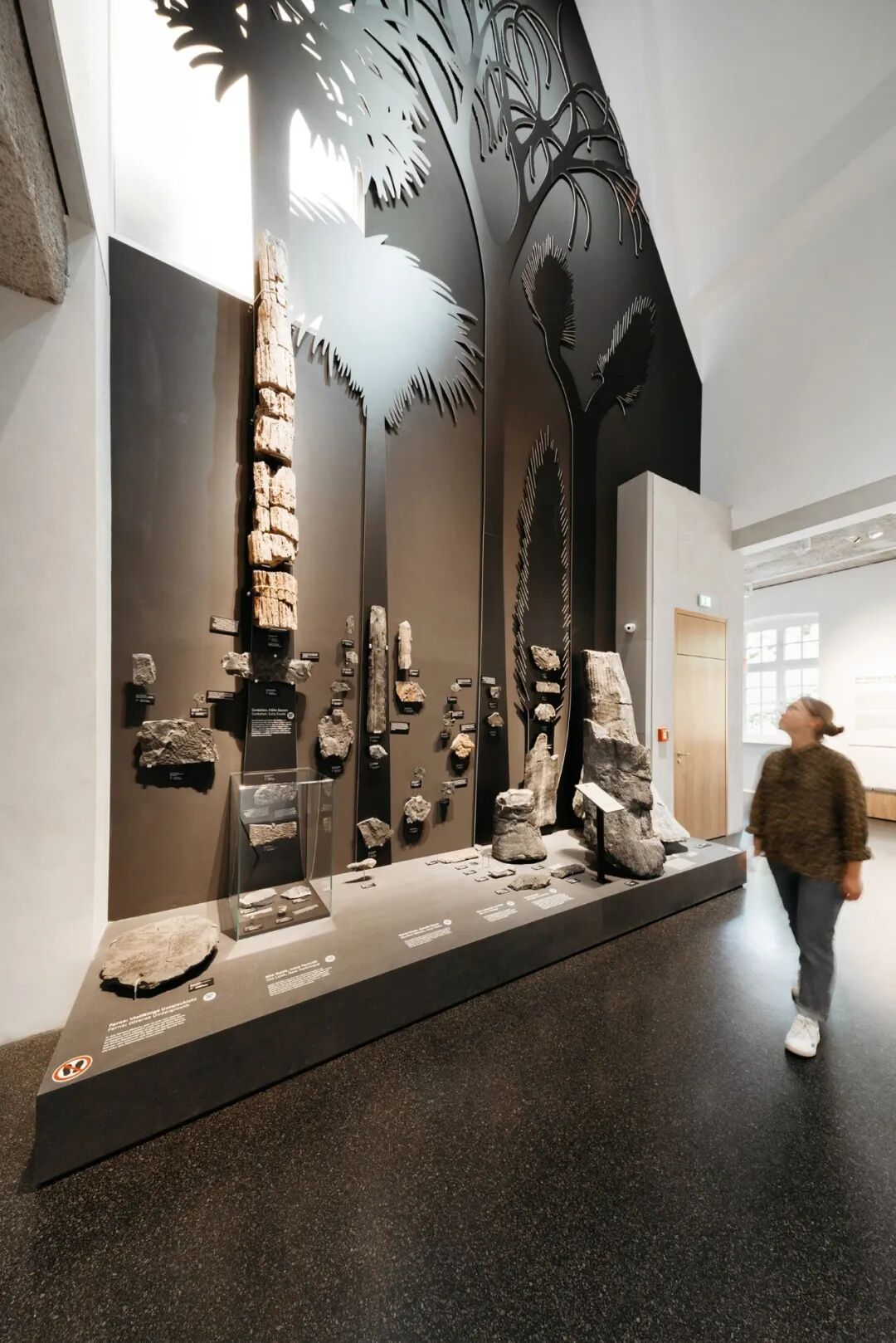 这些展品,其中一些是高度碎片化的,被反复情境化,并使用剪影般的轮廓进行展示。它们给游客留下了阿伦猛犸象的“室友”和延伸到天花板的碳森林树木的生动印象。在温暖的时期,动植物群以广阔的、季节性变化的媒体展示的方式温和地上演。