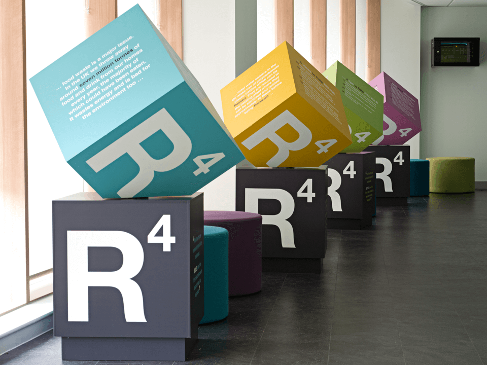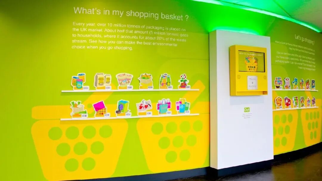 电磁铁互动游戏展示了废物流中两种主要类型的金属——铁金属和非铁金属是如何分离的。条形码游戏鼓励参观者在购买杂货时做出生态友好的决策。乙烯基墙面图形和水钟展示强调了重复使用物品的潜力,防止它们进入废物流。