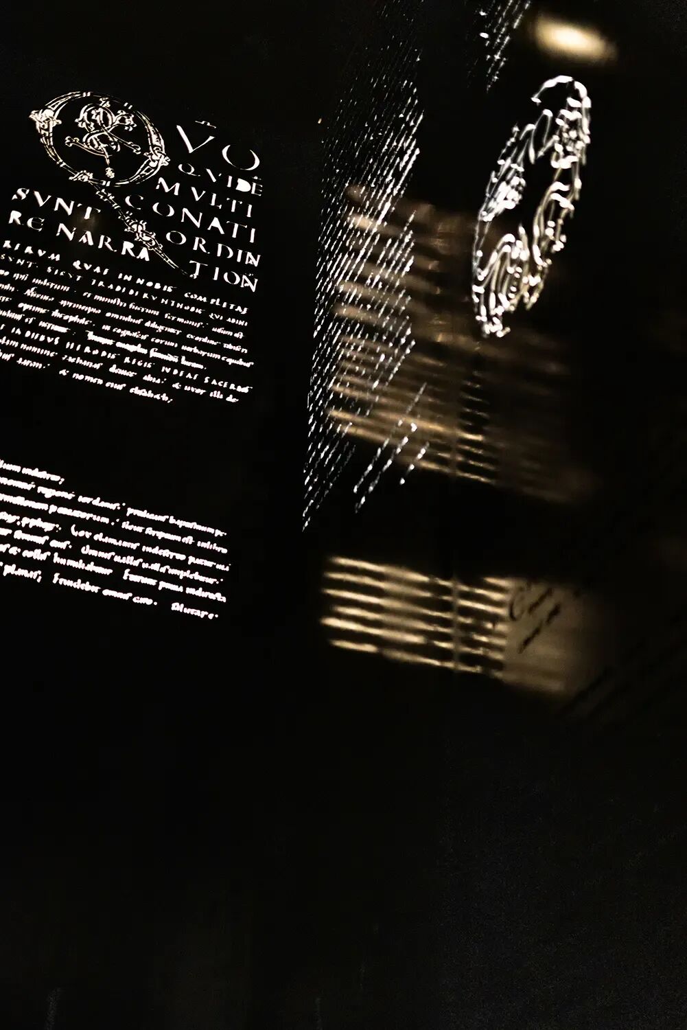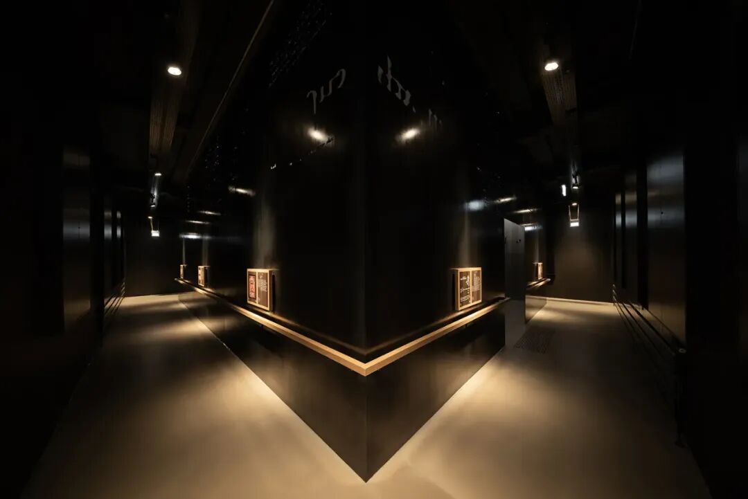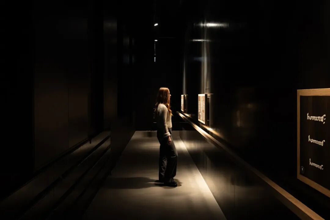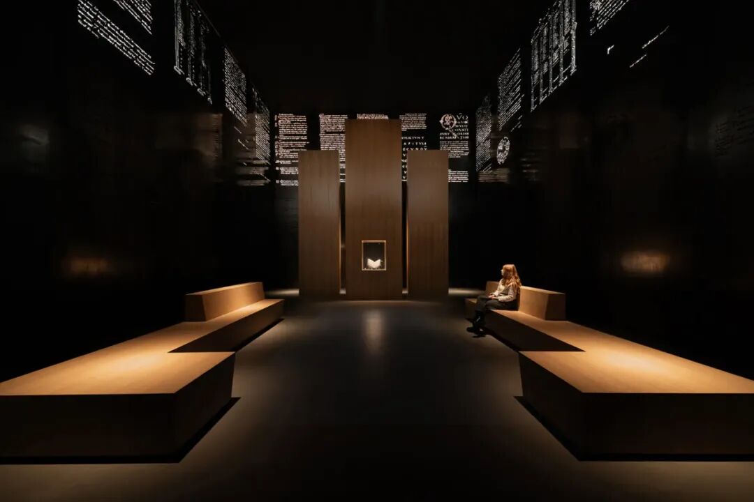 围绕手稿打造一个独立的暗调展厅,墙面采用吸光材料降低环境干扰,仅通过钢墙投影与局部重点照明突出展品,模拟中世纪修道院“抄经室”的静谧氛围,强化观众的沉浸感。