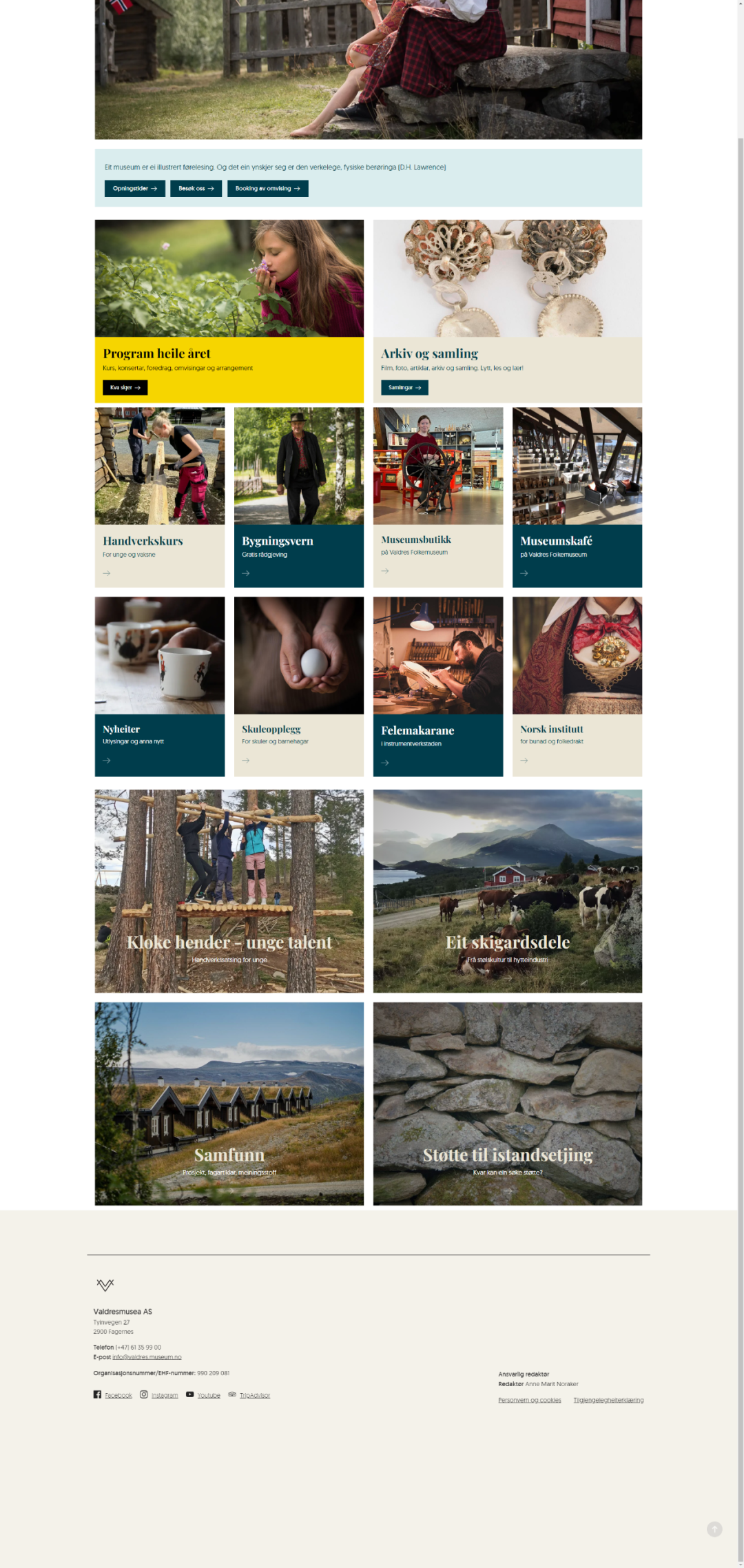 瓦尔德雷斯民俗博物馆位于挪威法格内斯,是挪威最大的露天博物馆之一,以展示挪威西部瓦尔德雷斯地区的传统乡村生活为核心,涵盖民族服饰(bunad)、手工艺品、家具、乐器等文物,强调传统与现代的对话。其展览设计围绕“叙事性、互动性、可持续性”三大核心理念展开,注重通过现代设计手法激活历史文化的生命力。