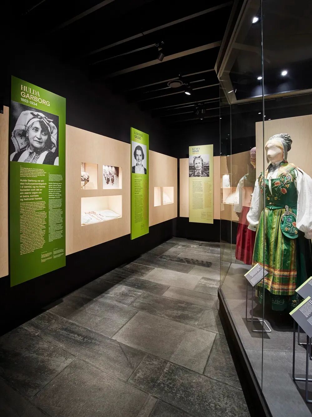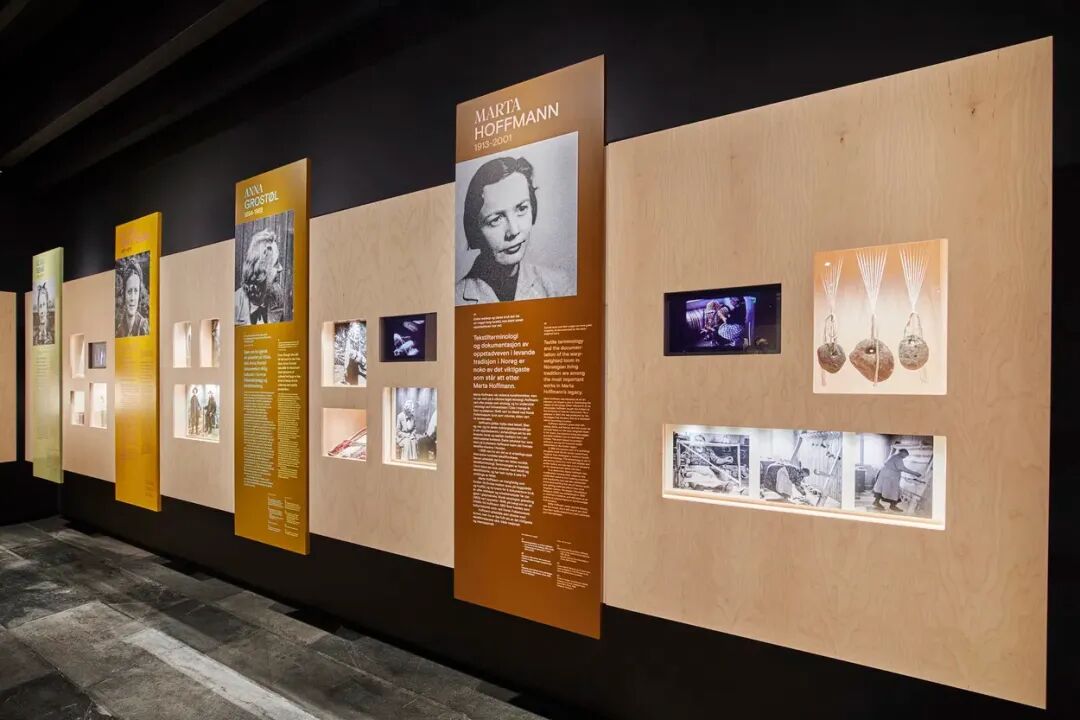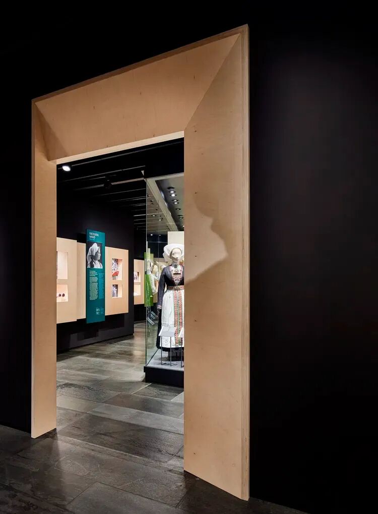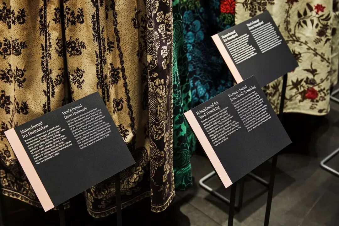 以桦木胶合板和黑色Valchromat(染色纤维板)为主材,营造极简质感,让展品(如bunad服饰、刺绣)成为视觉焦点;