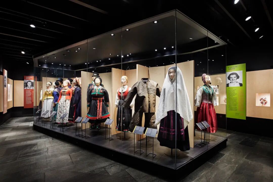 2021年由Snøhetta设计事务所打造的“Rotasjon”展览,是博物馆近年最具代表性的项目,聚焦挪威民族服饰(bunad)的传承与演变,尤其突出10位关键女性(包括挪威王后索尼娅)对bunad工艺的贡献。