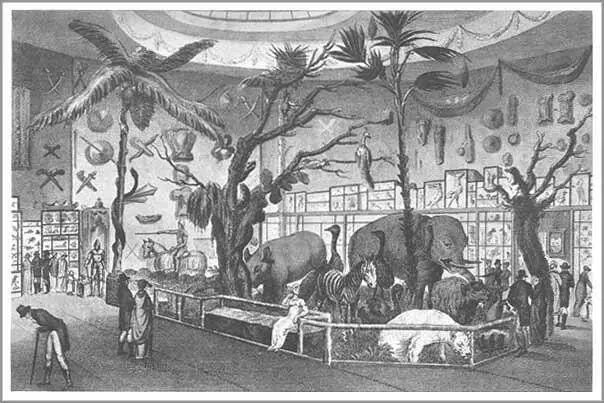 场景艺术在博物馆中的运用,可追溯至十九世纪初伦敦的威廉布洛克的博物馆,以“原地群居”的陈列方式模拟了“非洲哺乳动物群”的状态(如上图)。这些早期的场景已经表现出了非常成熟的理念和想法,它们给展品创造一种“具有写实氛围”的背景环境,强调一种氛围的营造,改变了以往孤立地看待“物”或者平面地看待“事”的传统观念,让展品间建立起一种相互关系,使观众产生一种“异时空”或“异文化”的体验。
