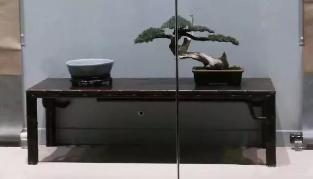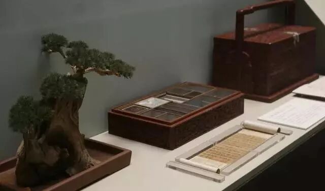 也许不少观者早就注意到,在几个特殊作品旁边展览还特意加入了充满文人意蕴的家具、盆景与瓷器摆件。从赵孟頫展开始,故宫展览部开始尝试在展柜之内营造小型场景,在原有的展柜玻璃上,则用半透明的磨砂贴膜进行覆盖,并将部分作品中的细节以喷绘放大于贴膜上,画中形象若隐若现,这大大削弱了玻璃对观众与书画的隔离感,留给观赏者最单纯的视觉体验,而能沉浸书画卷中,同时营造了整个展厅的氛围。
