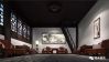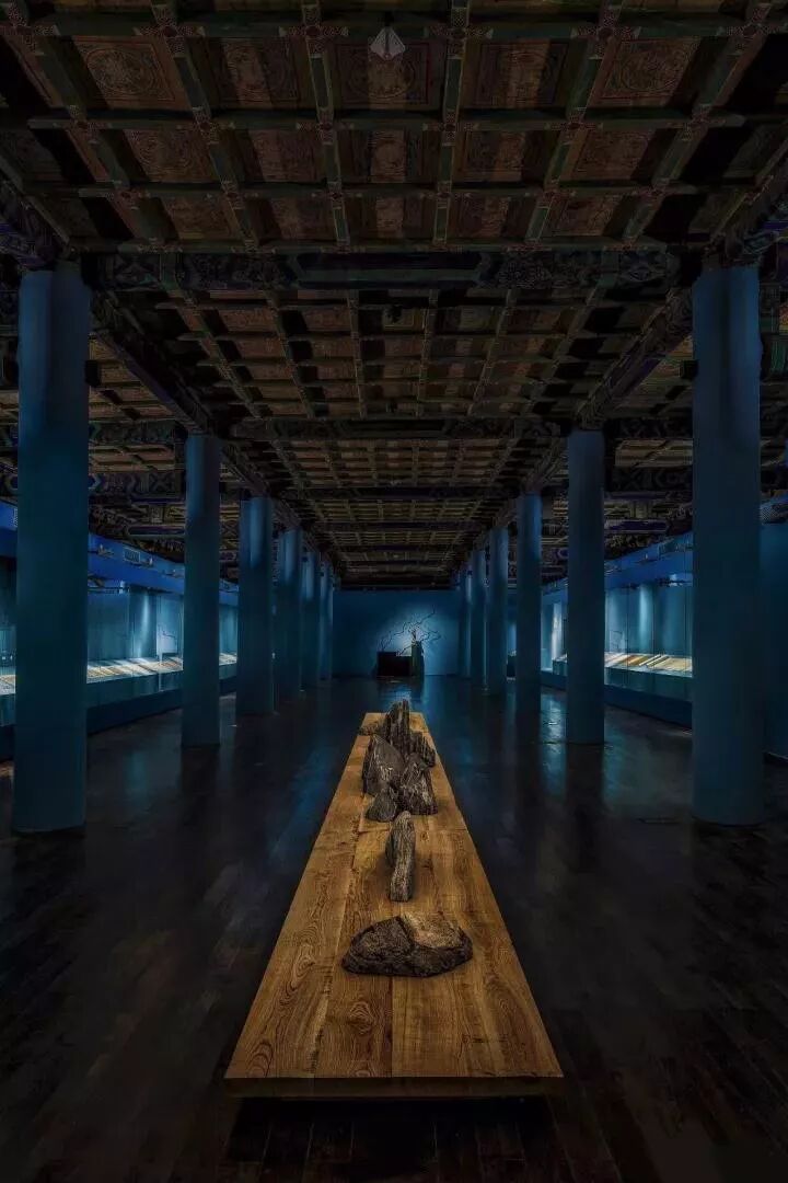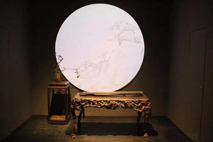 观众从过廊处往后殿遥望,好似从近山眺远山,云雾中一轮明月,奇木琴桌与仲尼式冷石古琴,完全是虚构的画面。站在近前,潇湘云水之曲与黄山奇景相配,四僧孤寂之心绪便投射在观者心中。