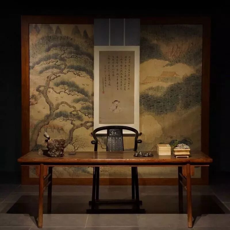 这间禅房好似半山中的一间茅屋,观众来到这里可以歇歇脚了。屋中的陈设模拟了古代僧侣的起居生活之所,陈设完全出自想象,却能追溯到明末清初的文人趣味,屋里有画案、禅椅,供桌、佛龛、盆景、根雕,墙上还挂着古琴,房间里还设置两组四条屏,分别取自四僧的作品局部,虽画风不同,却无违和之感,画面别具一格。