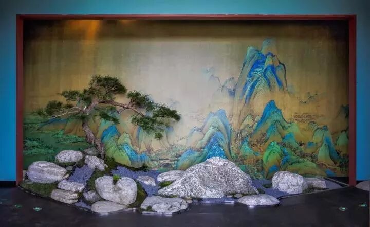 经过多次讨论,韩家英、故宫博物院展览部和设计团队将“千里江山”展览的基调色彩定为石青、石绿作为主色调铺陈,辅以泥金、绢白点缀,在展厅里适当之处以山石花木造景,并在空间中营造小空间。这与赵孟頫展览中的展陈策划不谋而合。