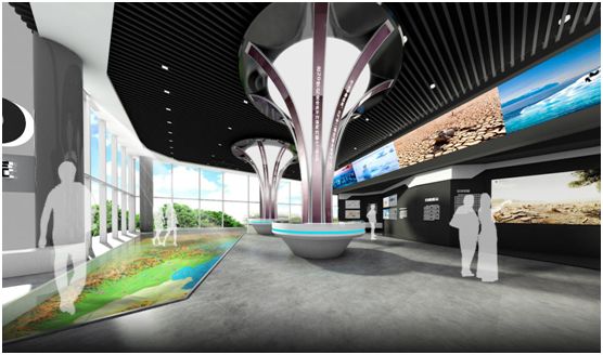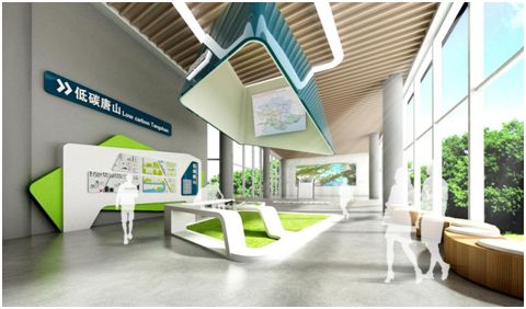 以“取于自然 归于自然”为布局思路,从自然力量的给予与反噬为立意点,结合唐山及南湖当地地域特色,设计出登录大厅、自然警示、取之有道、用之有度、南湖变迁、低碳唐山六大版块。