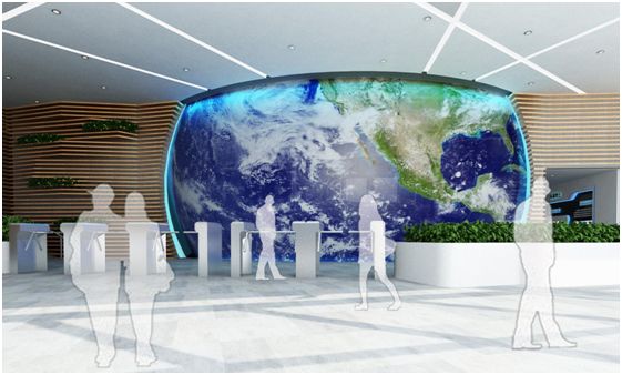 进入大厅,迎面是蔚蓝的地球,64平米超大弧形LED屏播放的地球画面,纯净而唯美,时刻提醒大家,地球只有一个,低碳刻不容缓。