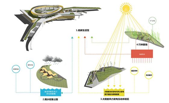 基于此,2016年唐山世界园艺博览会低碳生活馆(后文简称低碳馆)的设计从自然环境出发即室内外一体化设计,将雨水收集公园、竹林剧场、太阳能科技展示区、低碳展示馆四大主题区进行全局统筹,场馆内、外展示内容相互呼应,形成风格统一的有机整体。