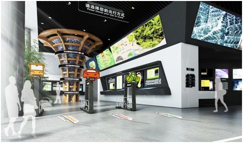 观众自行选择自驾、公交、自行车三种出行方式,上方LED屏滚动显示数据,不同出行方式的碳排放量一目了然。
